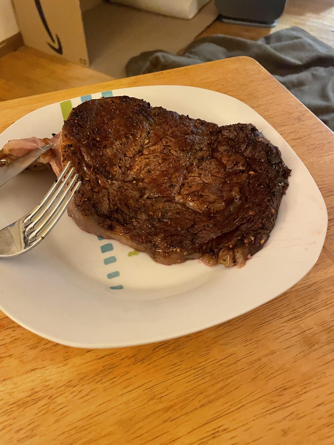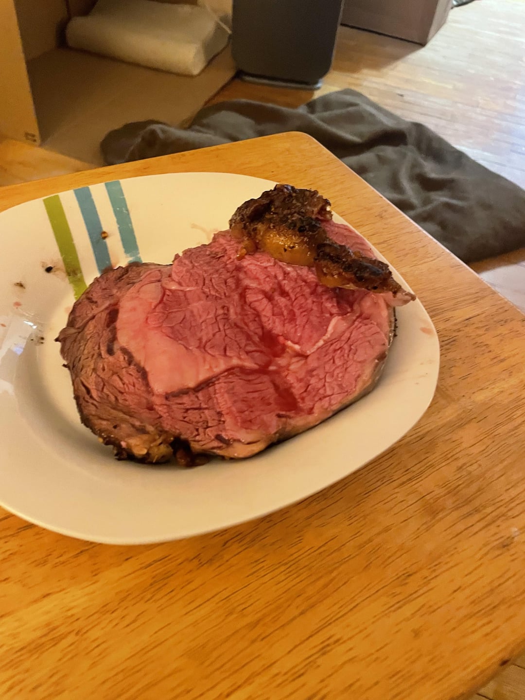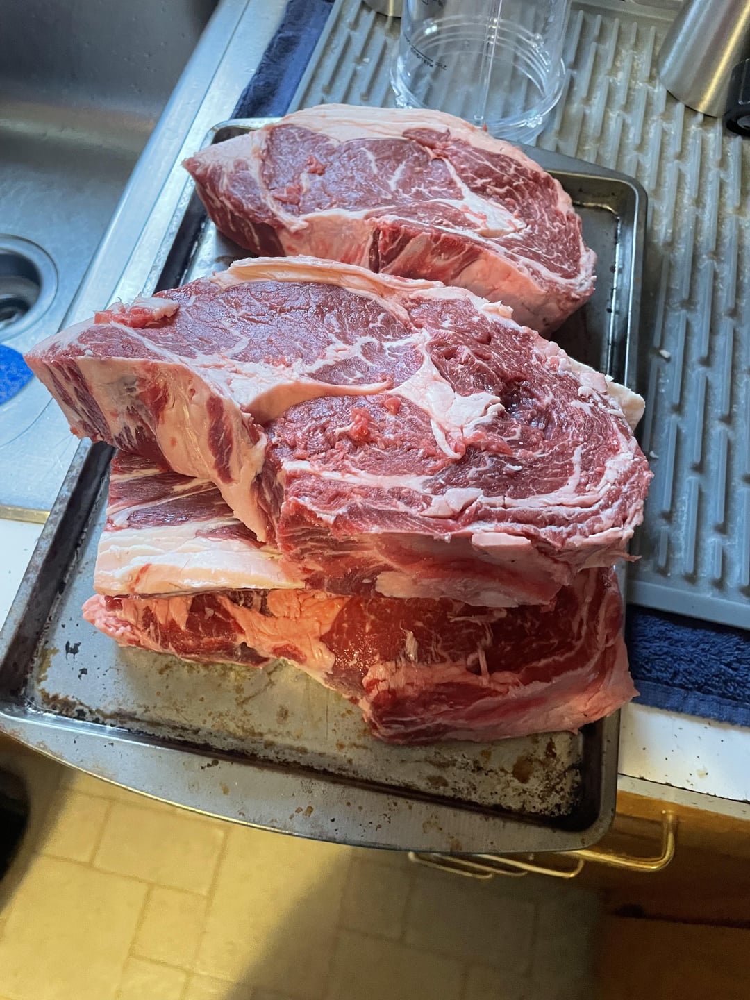 Anytime rib roasts go on sale for a decent price I go buy some for smoking as roasts, and slicing into 2” or so chunks for us to season, chamber vac, and then later souse vide for me and my husband. We usually slice one of the thick ones in half so we get both sides each. Tonight’s was done before frozen so did a reverse sear.