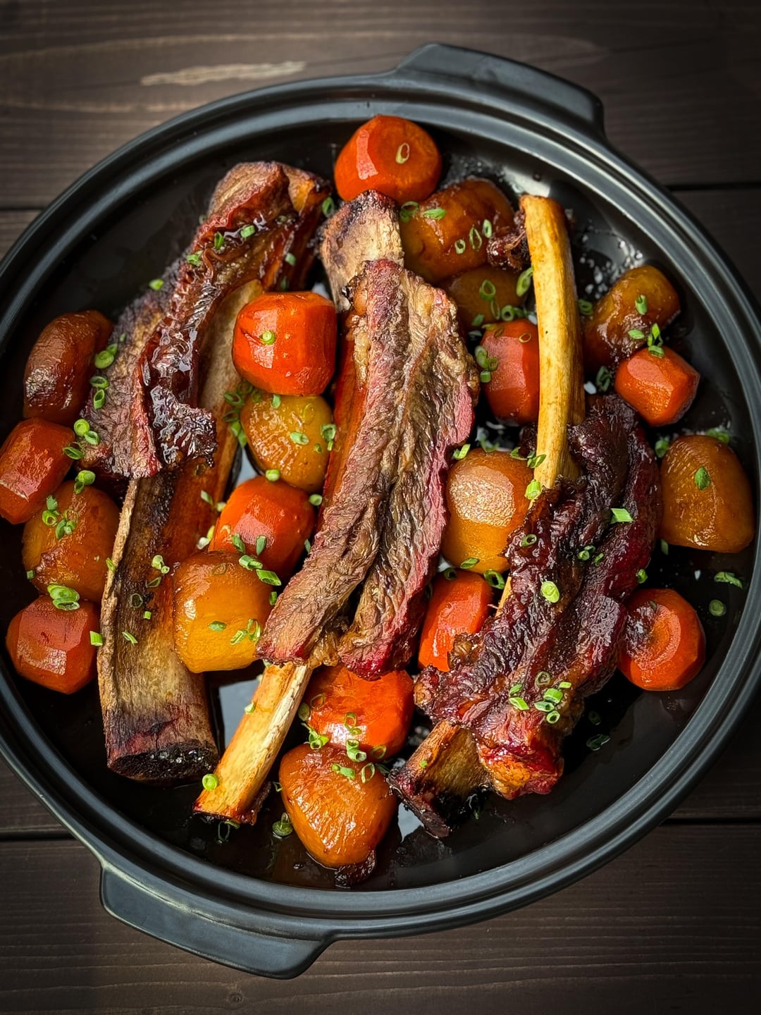 Galbi-Jjim is a traditional Korean dish of beef short ribs, Mü (무 / Korean radish) and carrots, slow-braised in a savory and sweet soy sauce based braising liquid. The braising liquid, called Mat-Ganjang (맛간장) is soy sauce and cooking alcohol (맛술), infused with Korean pear, onions, garlic, green onions, sugar, dried mushrooms (포고버섯) and dried seaweed.
