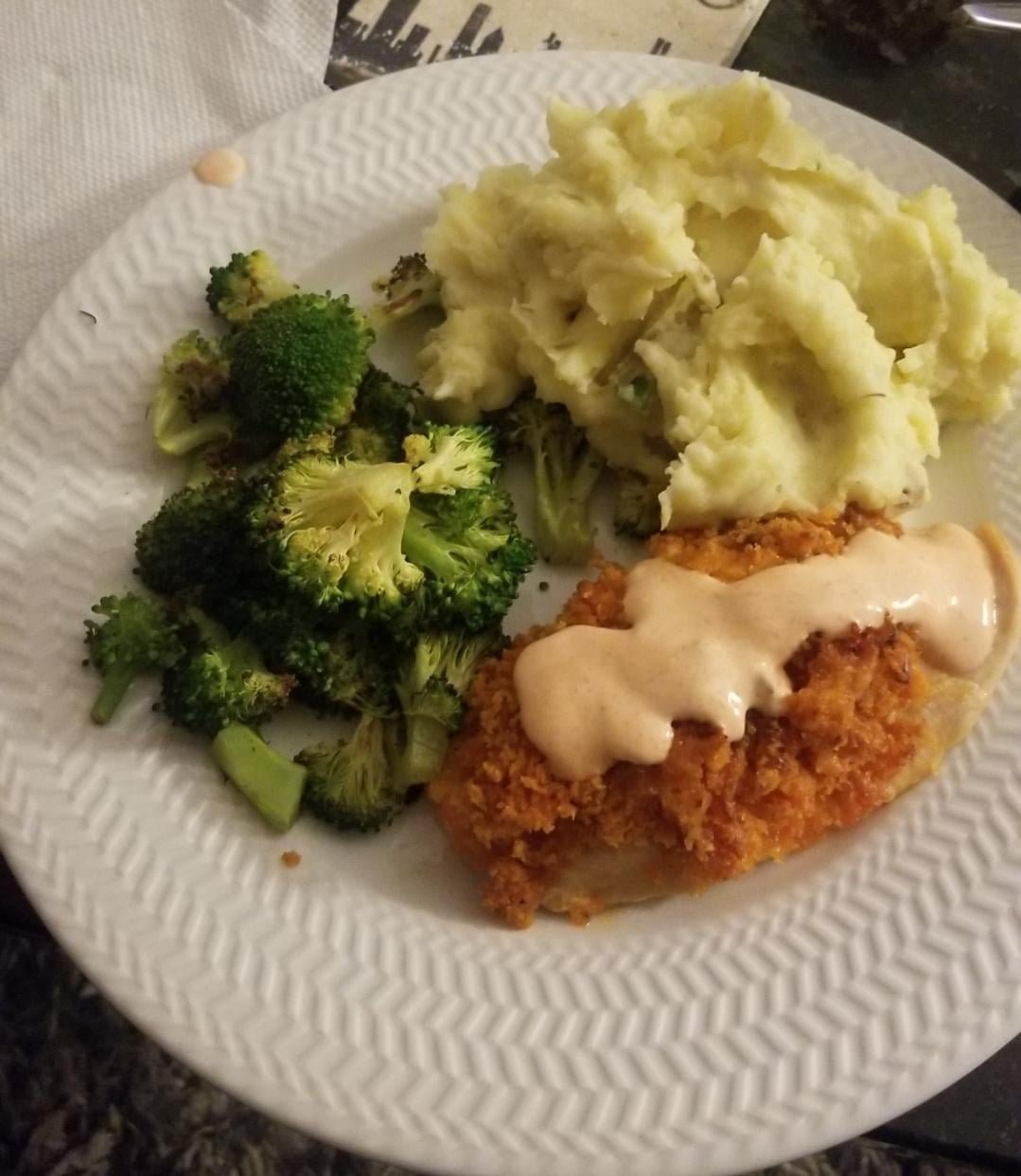 I don't know if the mashed potatoes and broccoli were part of the recipe or not.