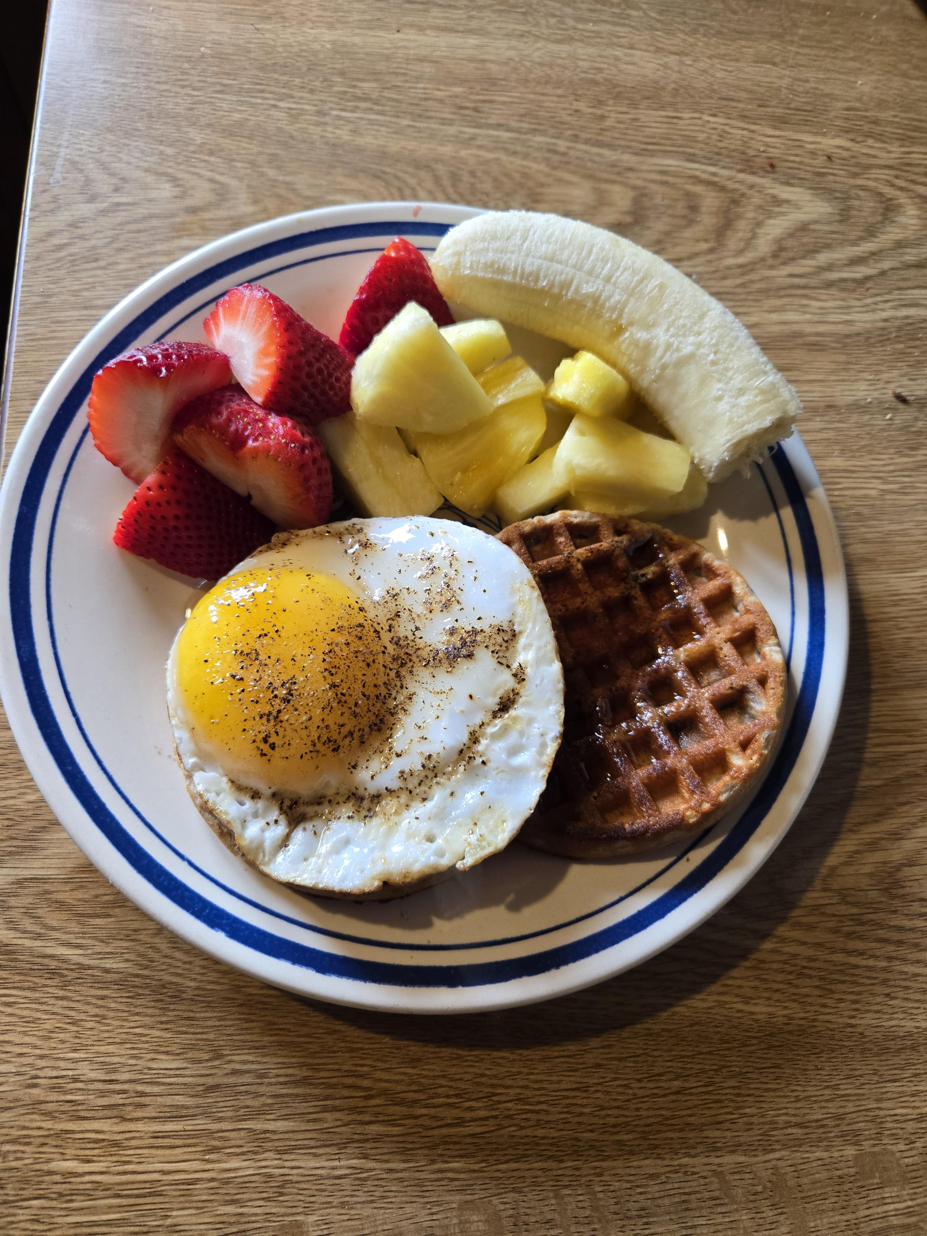 I was hungry for a few different things this morning. Duck egg on blueberry waffles and some fresh fruit.