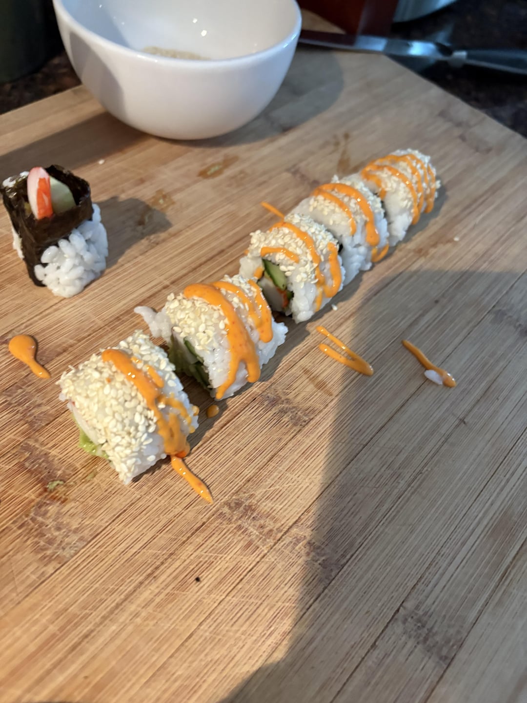 Good progress but for the love of wood don’t sauce on the cutting board. Sushi places sauce on the serving plate.