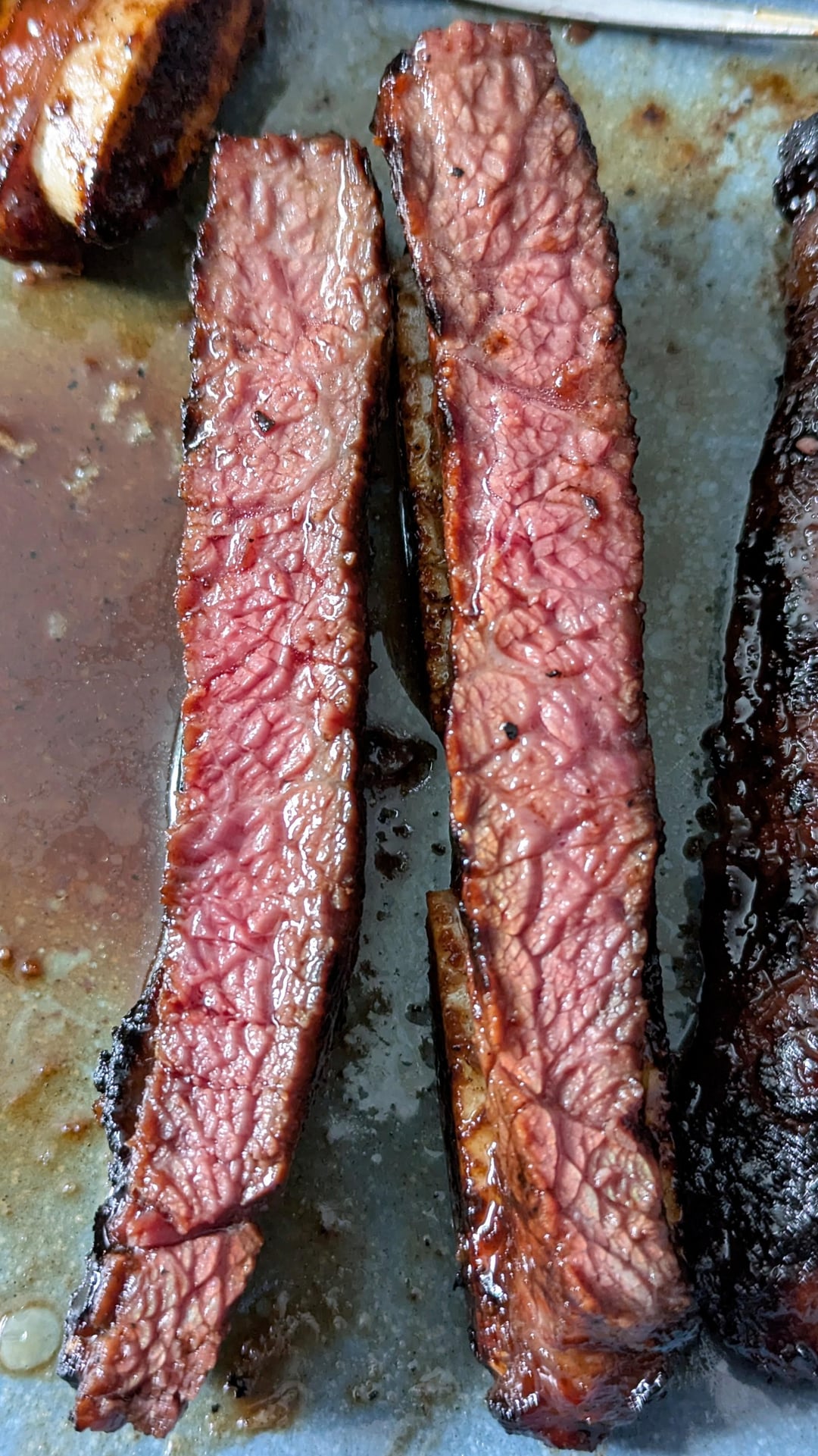 With the thick cut, these were marinated overnight in a favorite kalbi / galbi sauce before grilling.