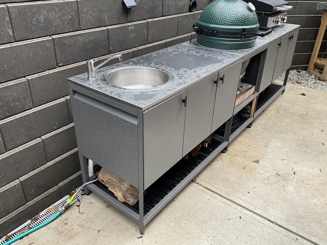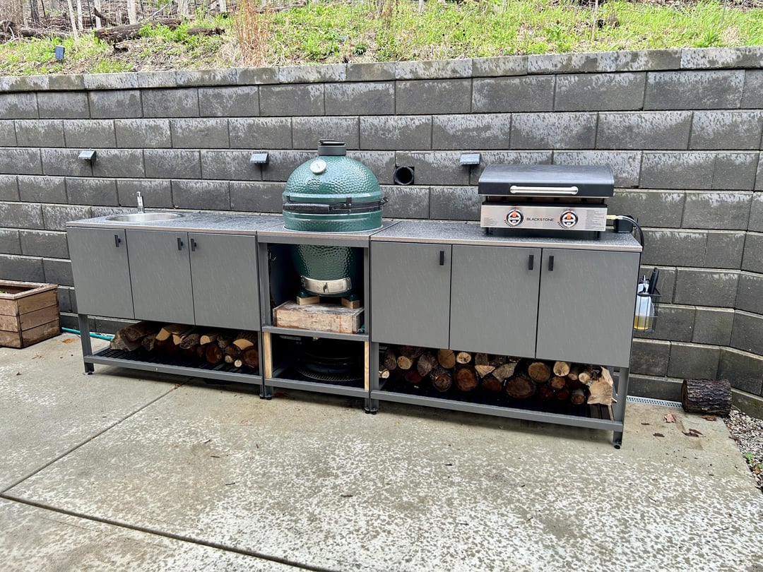 I wanted to do a modest outdoor kitchen to give me prep space around the BGE and to get it out of the rolling nest. Stumbled on the IKEA Batskar cabinets which fit the modern look I was going for and cost around $1k. Top is thin stainless but good enough. Fingers crossed that the powder coated cabinets hold up to the Midwest winters, but the investment was small. Cut a hole in the stainless to of the open shelf unit to fit the egg and reinforced it a bit. Added a silicon gasket around the cut opening. So far, so good.