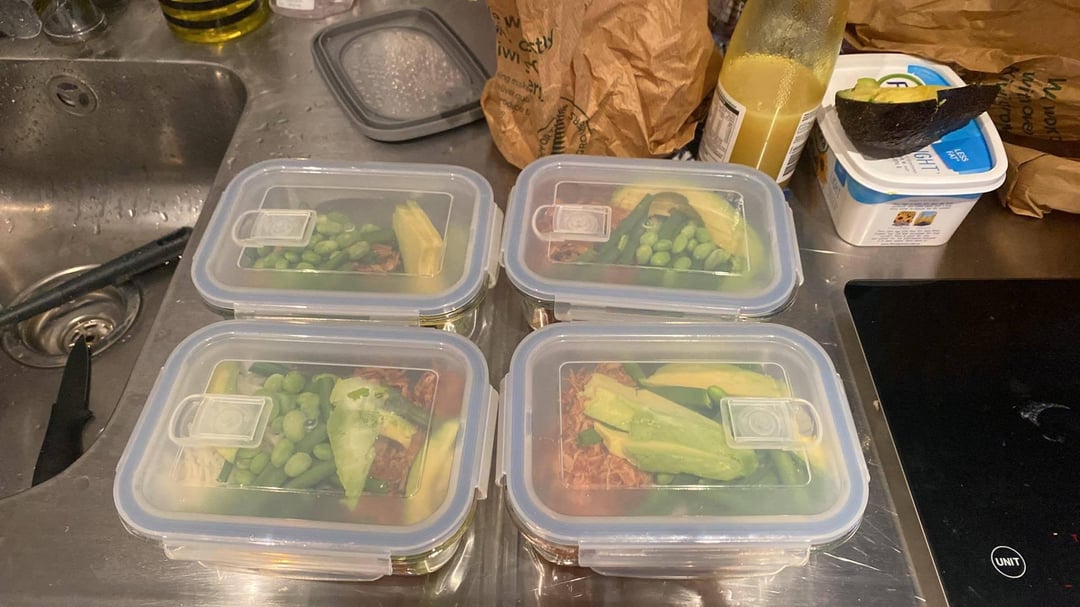 Second pic: pulled chicken breast 120g each, 80g rice, 20g edamame, green beans, 35g avocado