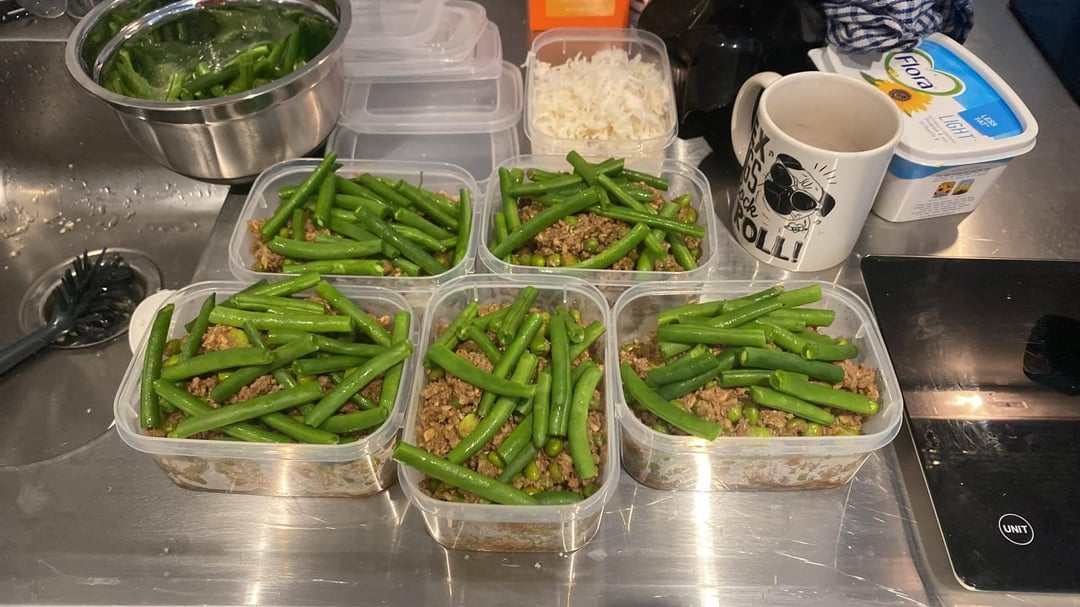 First pic: 500g extra lean beef mince, 500g mushroom, 200g edameme, 150g peas cooked with Thai red curry paste. 80g rice per serve. Green beans fresh.