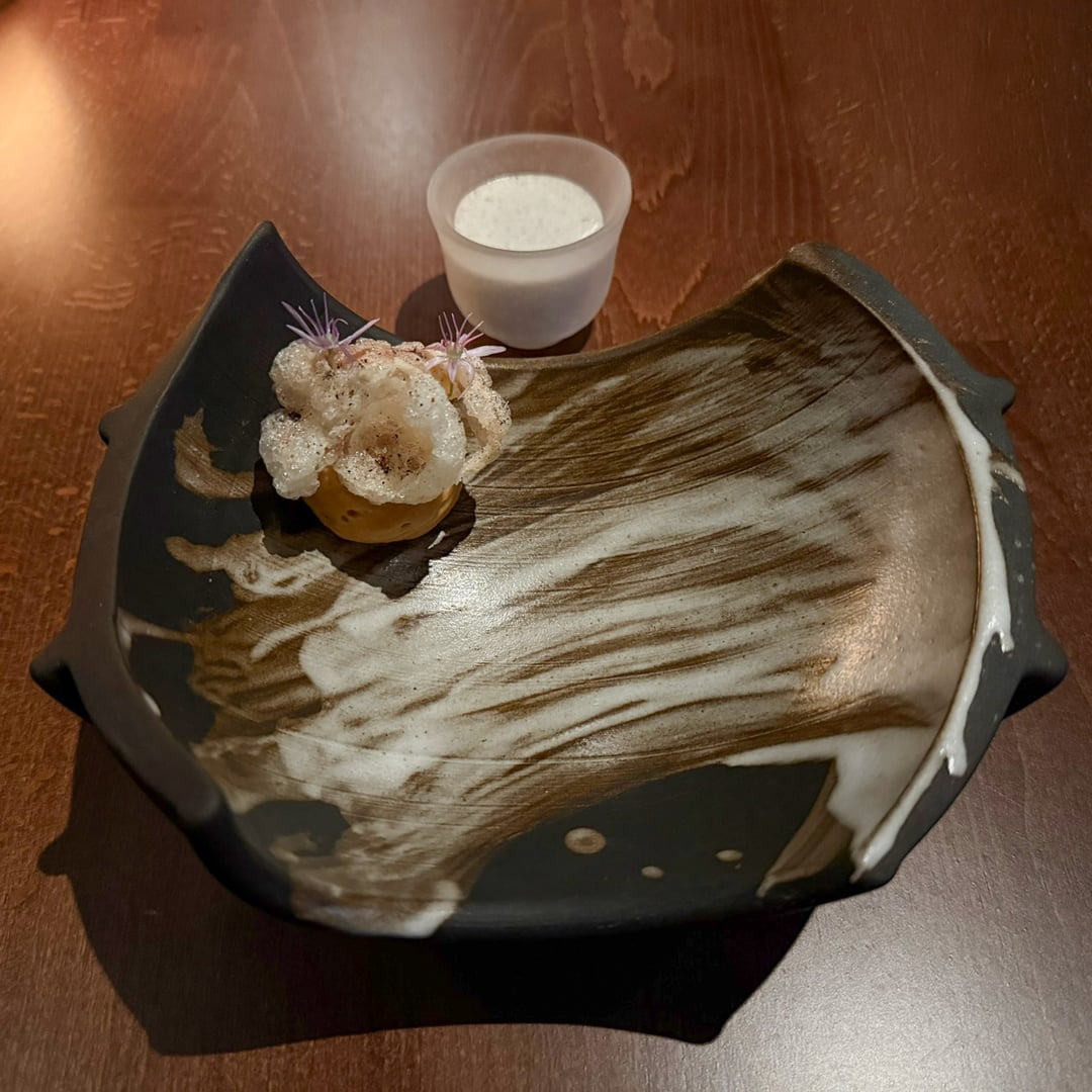 - puffed beef tendon & caramelized onion / black truffle milkshake