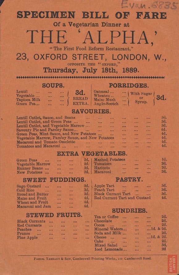 An 1889 menu from The Alpha Restaurant, considered London’s first Vegetarian restaurant. Est. 1879, it was initially opened at 429 Oxford St. Dining and Cooking