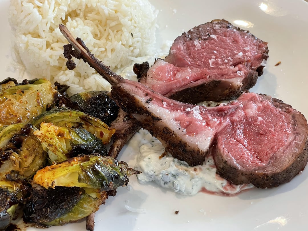 133° for two hours, iced for 15 minutes, seared on charcoal with cherry and oak. Seasoned with Fennel Pollen, Sumac, granulated garlic, Aleppo pepper, S&P. Served with roasted and glazed Brussel Sprouts, toasted Basmati Rice and Yogurt Mint Sauce. Medium Rare or Rare? Delicious! I normally reverse sear this cut. My wife had to throw hers back on the grill because she thought it was too rare.