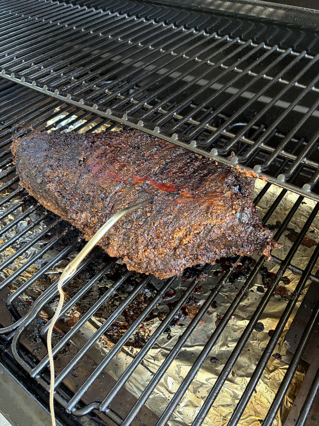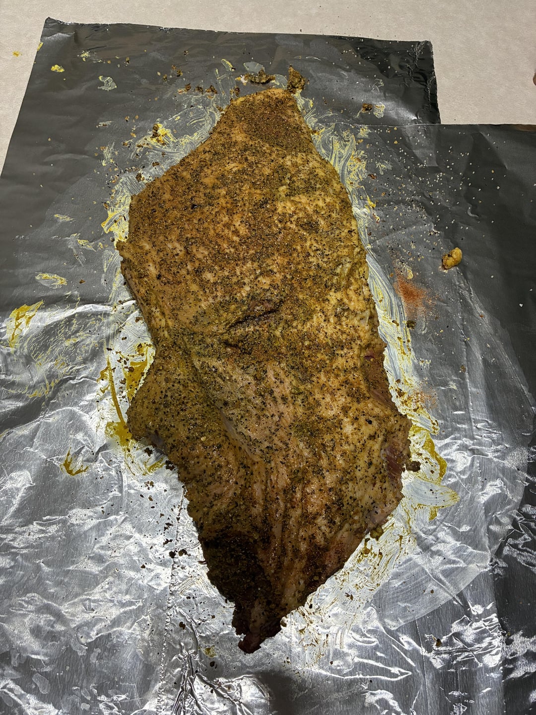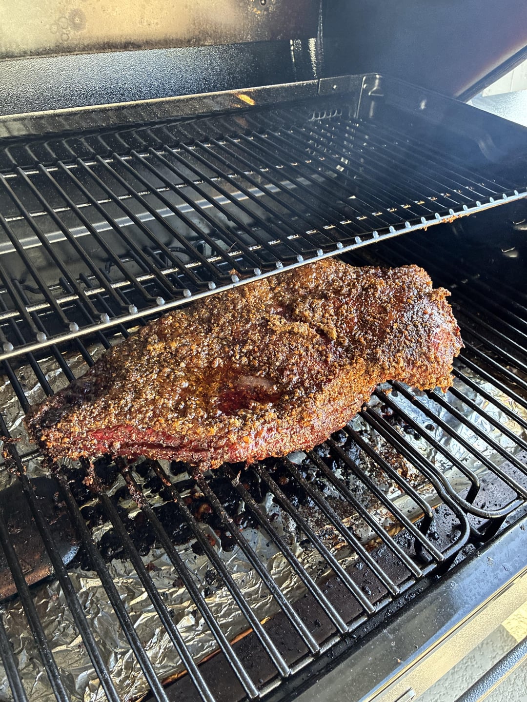Alright to all the questions; I have a Traeger ironwood XL, trimmed fat (sounds like I may have done too much), rubbed in mustard and then seasoned with Traeger coffee rub and a steak blend rub. Started at roughly 8pm and let it sit overnight unwrapped at 190 degrees (fat cap up). Remembered in the morning somebody on my previous attempt said fat cap down on the Traeger so around 8am I flipped it, again still no wrap (another previous comment stated try no wrap) I also bumped it up to 225 in the morning. Pulled it at 205 temp (roughly 4pm / 19 hours) and wrapped in foil and placed in cooler to rest for an hour. That’s it.
