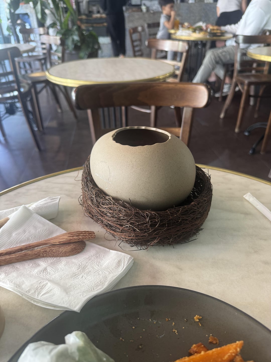 Yogurt in the egg I assume? I don’t think that’s terrible, as it’s probably ceramic or plastic and can be washed easily. It would be kinda annoying to eat though unless the utensils are extra long.