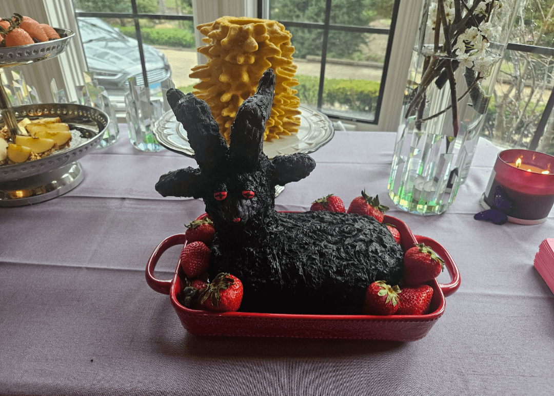 Biblically accurate angel cake behind the demon goat