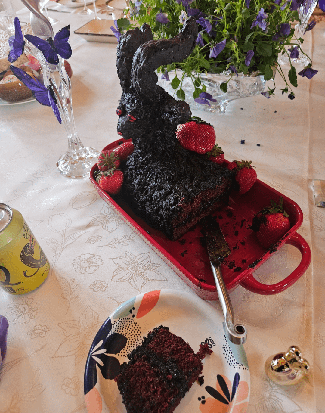 He’s a red velvet cake with a blackberry jam and dark chocolate frosting. My family found him very charming.