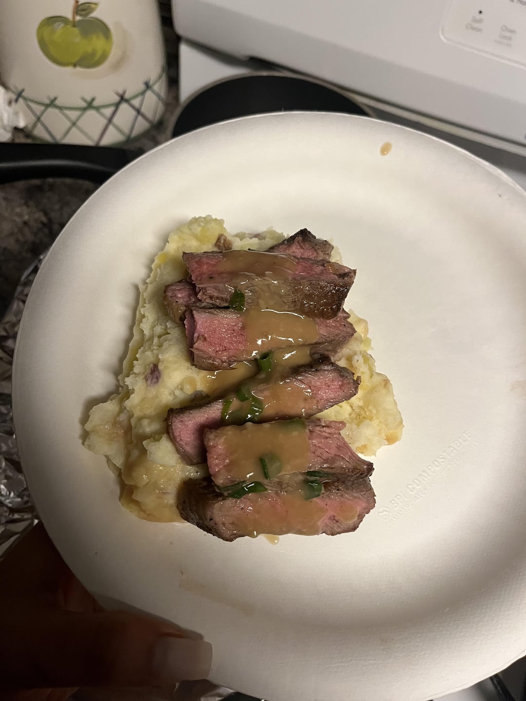 My first time making a NY strip steak. I mostly made it for my boyfriend and he likes it cooked this way. I basted it with green onion and garlic which I never done before. The only thing I want to make sure I remember for next time is to render the fat fully, I always somehow forget and try to rush and do it at the end! I found the fatty part is way tougher on the NY strip. With that being said I enjoyed the ribeye more that I made the other week but NY strip isn’t bad.