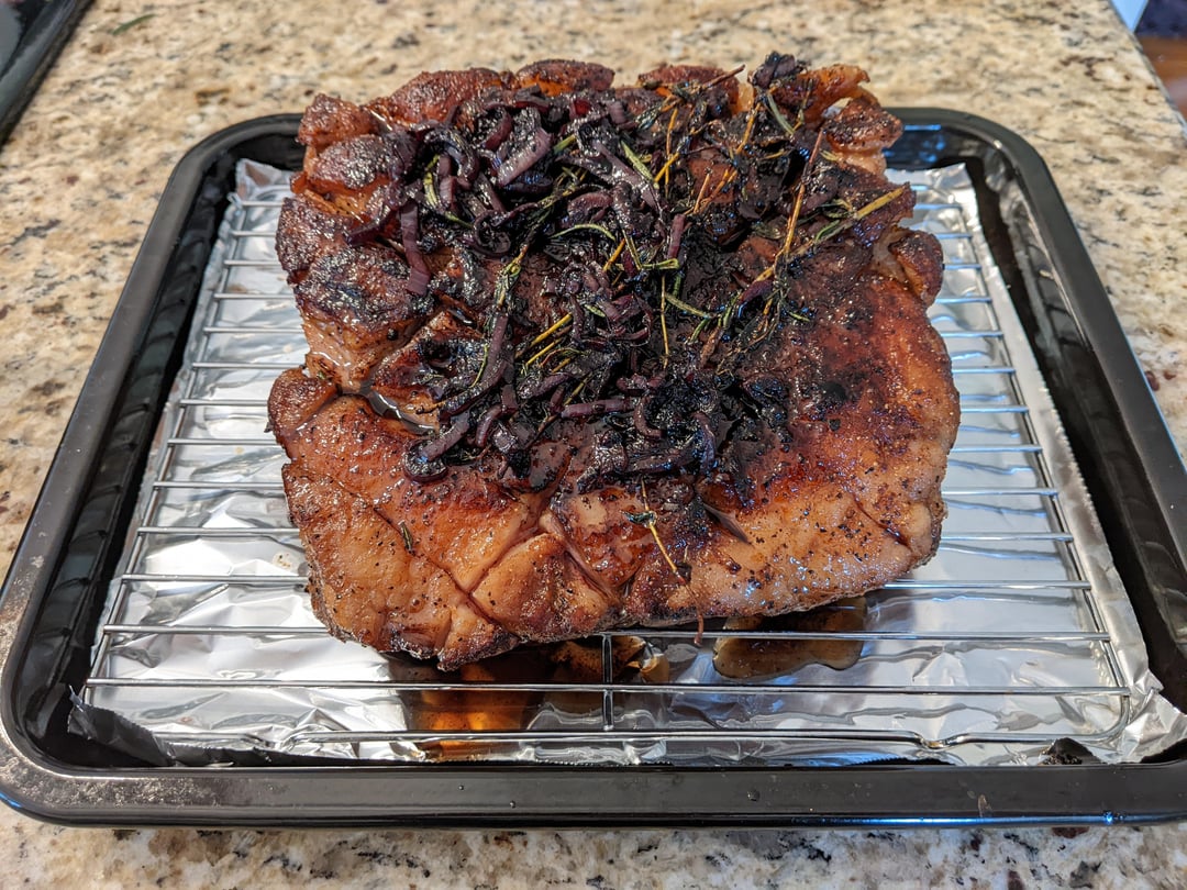 Decided to try out a strip loin roast for Easter this year. I started by cutting a 4 pound section and then trimming the fat cap evenly to about ¼ inch. I then scored the fat cap and put on a rub I made of 1% salt (by weight, so about 18 grams), black pepper, brown sugar, garlic powder, onion powder, and paprika. I let that dry brine in the fridge for about 24 hours. I seared the roast on all sides, then threw some shallot, a couple of thyme sprigs, and a rosemary spring into the pan to fry in the drippings. I deglazed with ½ cup red wine, and reduced all of that together until it was a thick glaze. I then poured that over top the seared roast, and bagged it. It went into the water at 136° for 6 hours. When it was done, I made the same exact rub again, this time adding 2 teaspoons of red wine vinegar to make it into a paste. I dried off the roast and rubbed the paste on and stuck it into a 450° oven for about 15 minutes. Served it with a jus made from the bag juice, 2 cups beef stock, and ¼ cup red wine that I reduced to about half.