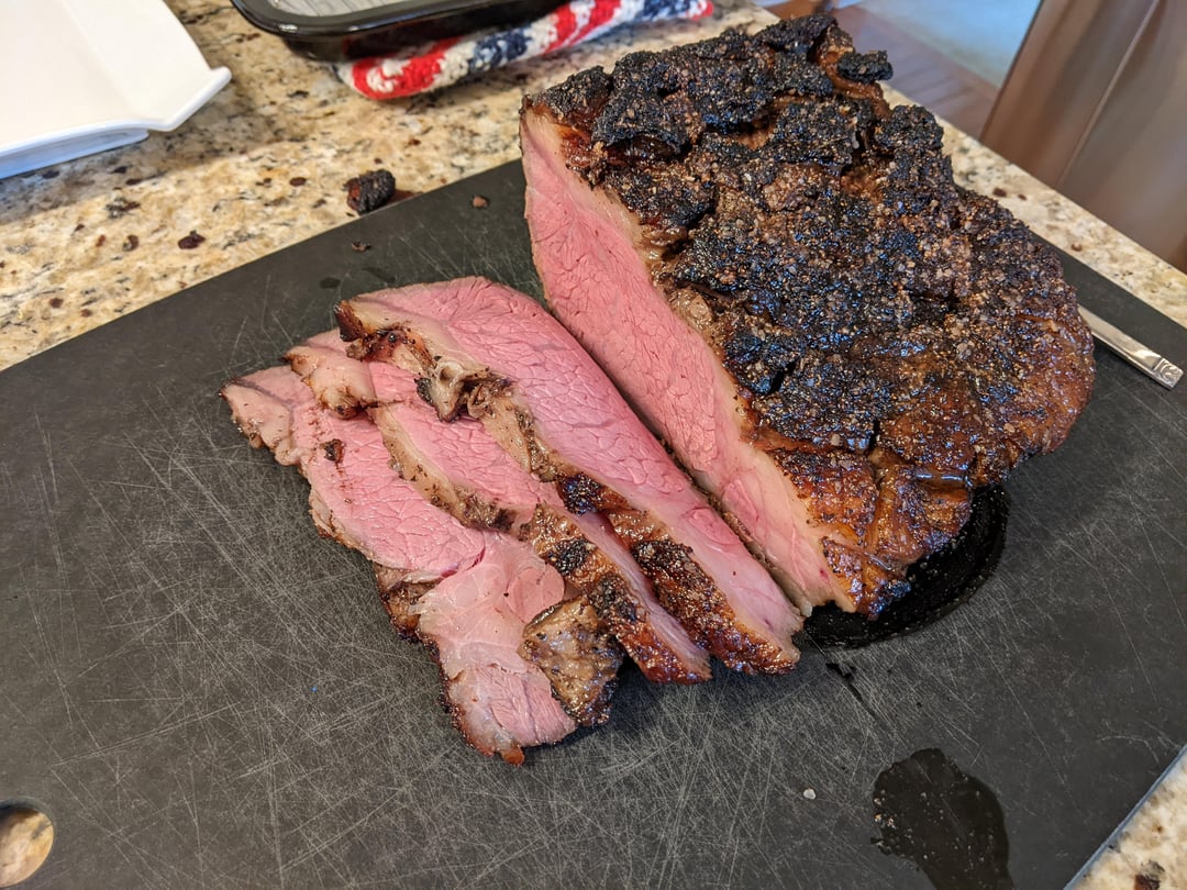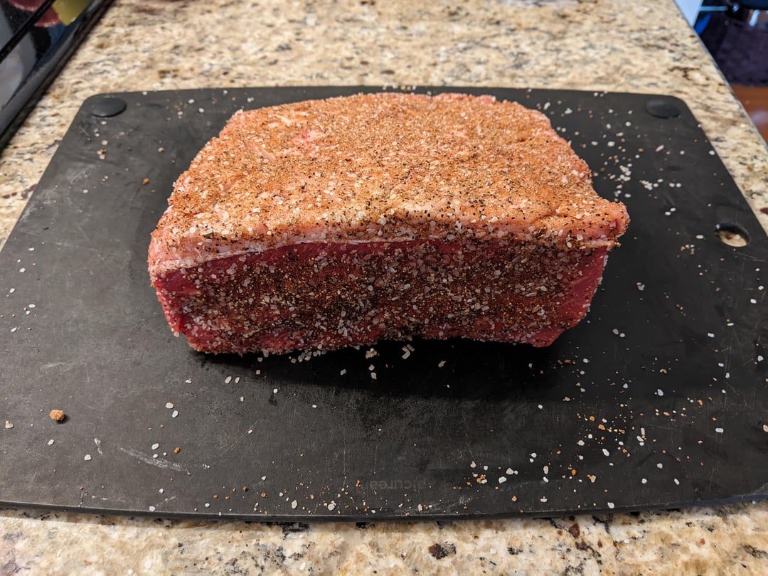 Overall the guests were very impressed and loved every bite of it. I personally think it had too much black pepper from the double application, which also scorched a bit during the sear, which was a noob mistake that I should have never let happen. It didn't ruin the flavor but it brought the quality down, in my opinion. I also wasn't wild about the jus and wish I had just made a red wine reduction instead with the bag juice. I'm not sure I'm sold on sous vide for next time. I think reverse searing it and letting that crust build up over hours in a low oven would make it better.