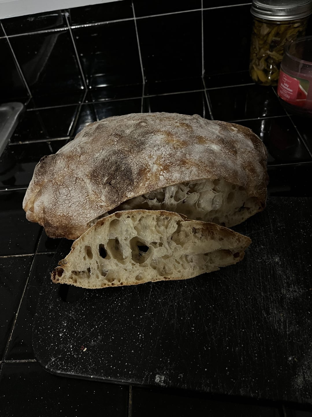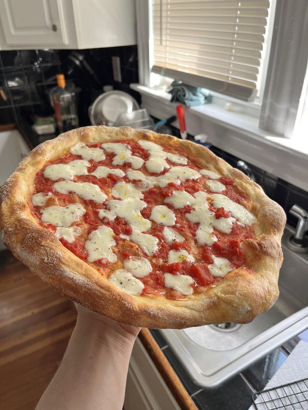 Working with King Arthur Special patent flour, Stanislus tomatoes, and galbani mozz. 78% hydrated, 2% oil, 3% salt, 0.16% instant yeast. Mix to combined— fold 3x in 45 min intervals. Total bulk ≈ 20 hours. Ball and fridge for about 72hrs. Very difficult dough to work with— I meant to fridge for only 24hrs but life gets busy!! Used 1000g flour to get 6 dough balls at 300g. Made a decent ciabatta with the last 2 balls by flipping them onto each other and baking…
