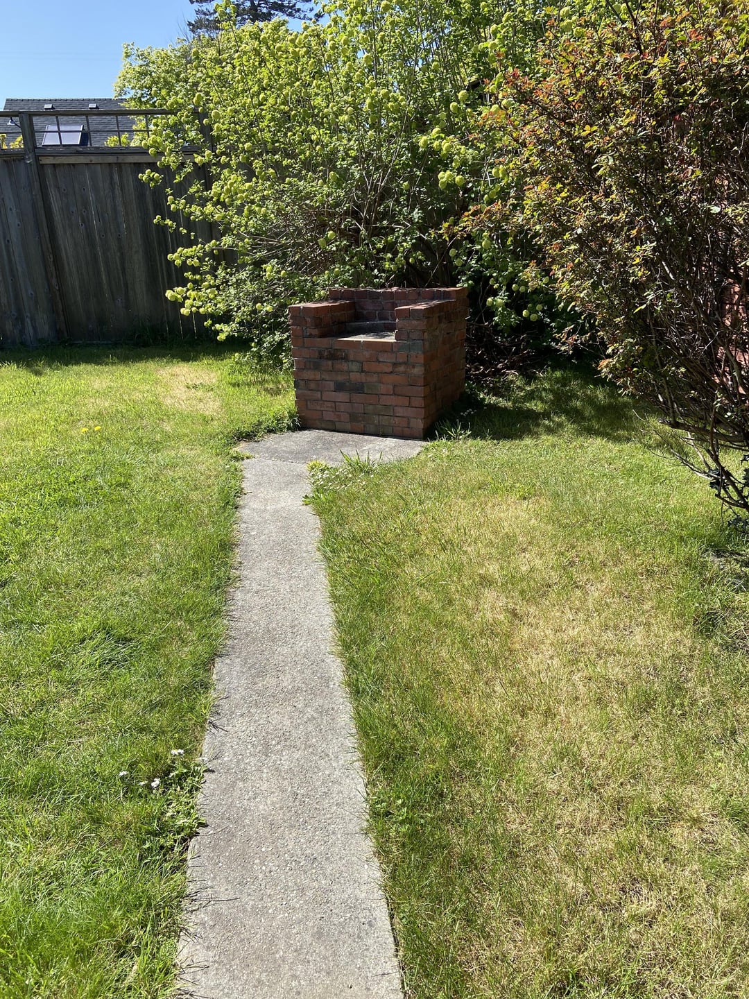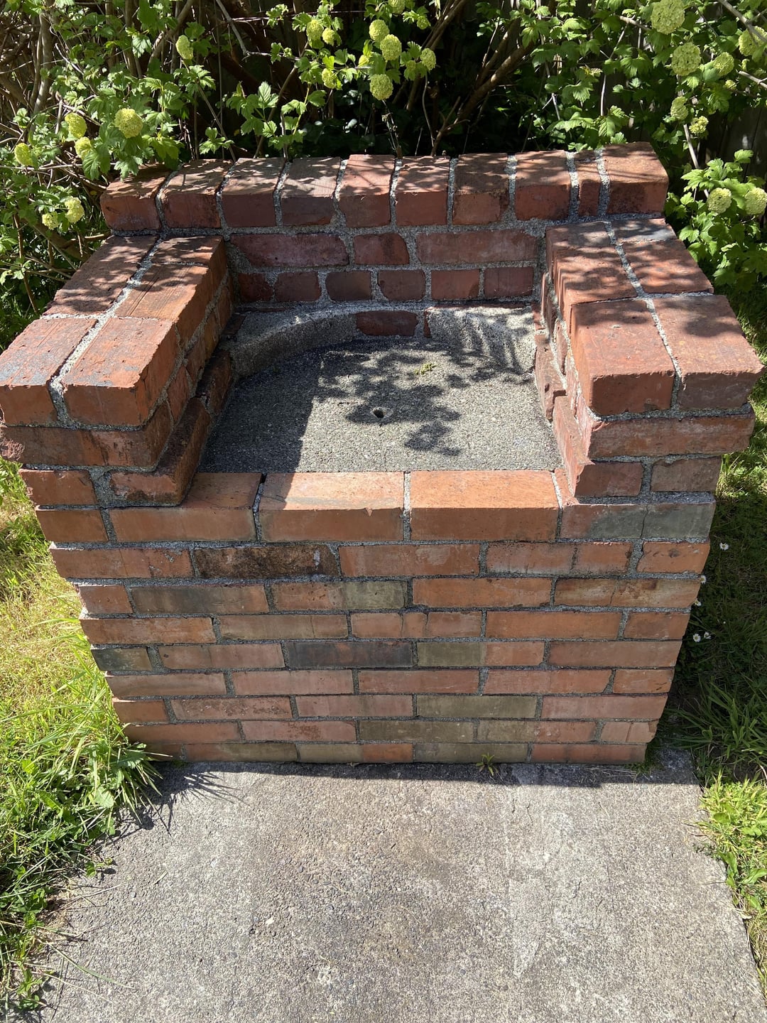 We bought this house, and this brick structure is in the back yard and I’m not sure what it is. Could it be a brick grill? There is a paved path to it from a back patio, and a little brick lip that you could conceivably put a metal rack on.