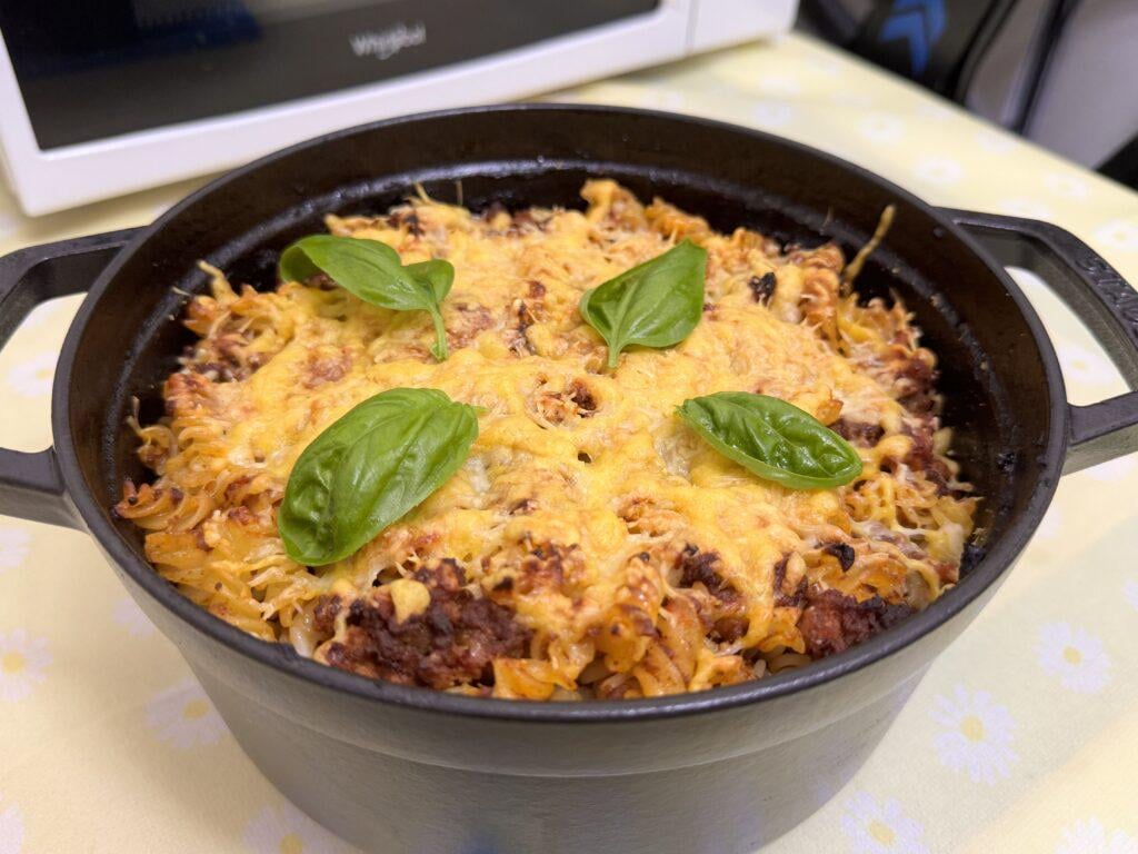 Baking your Bolognese in a Dutch oven results in a deeply savoury, caramelised sauce that is superior to Bolognese made on the stovetop. Oh, and adding cheese never hurts.