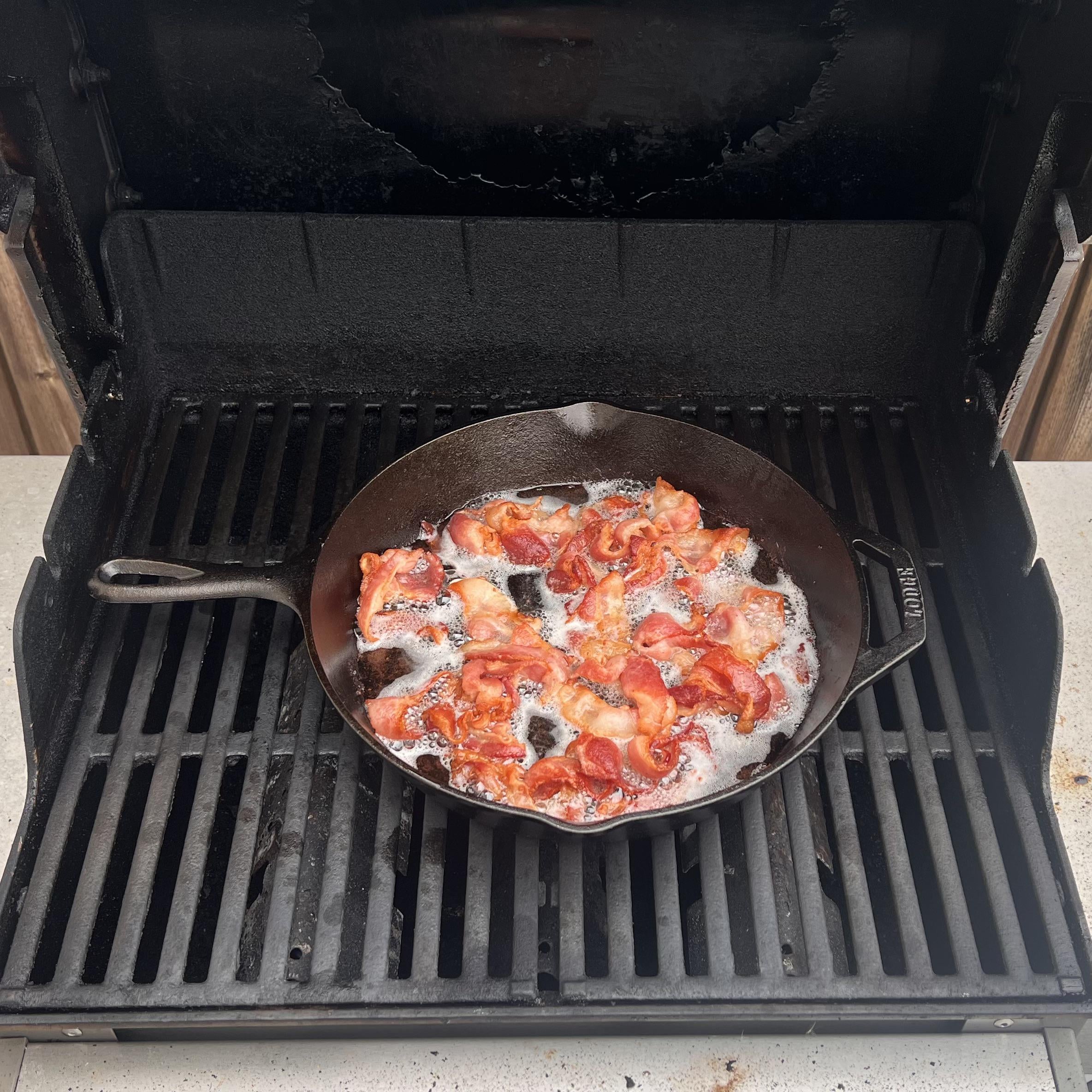 Bacon in cast iron on the grill keeps the stovetop clean and the stank out