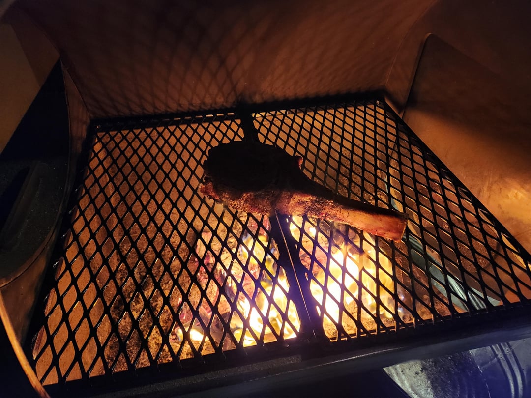 – Pulled it off, built the fire back up real hot. Threw steak on the grates directly over the fire in the firebox itself.