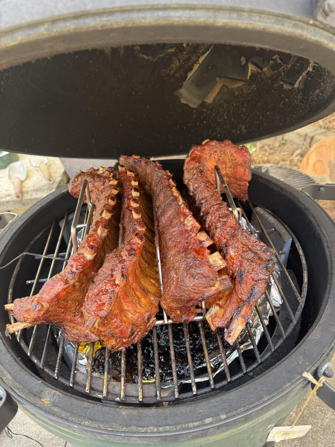 They look good to me! I‘m a member of the lazy no wrap club. Not just for ribs, but brisket, pork shoulders, etc. No peeking either. Fireboard tells me when it’s almost ready, and for ribs you can hear them- that sizzling, crackling sound. BGE keeps things nice and moist when you’re not opening it up: if you’re looking, you ain’t cooking…