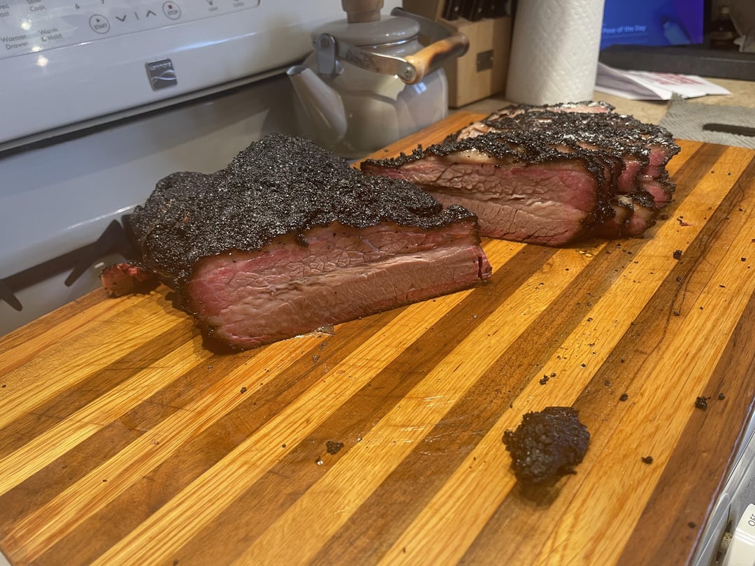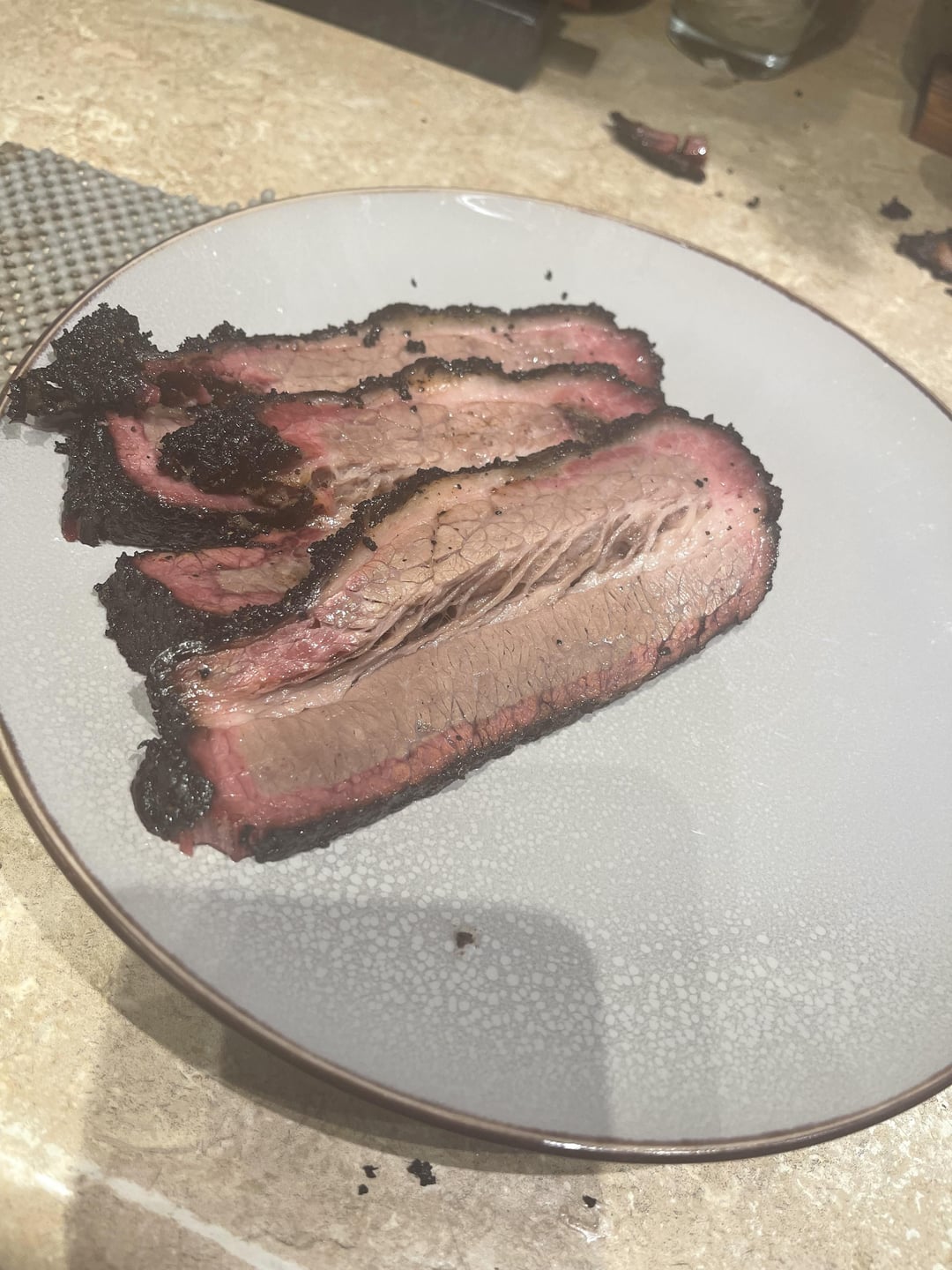 Got dealt some less than ideal hands, instacarted the brisket (dasher gave me one that wasn’t ideal) and rain/thunderstorms came out of nowhere halfway through the smoke but smoked at 250° on a chargriller pro offset smoker for 15 hours, pulled at 205° and rested for 4 hours, seasoning blend of salt, pepper, brown sugar, cajun, granulated garlic and paprika. The flat came out a tiny bit dry but nothing a little bbq sauce can’t fix and the point is like eating meat butter