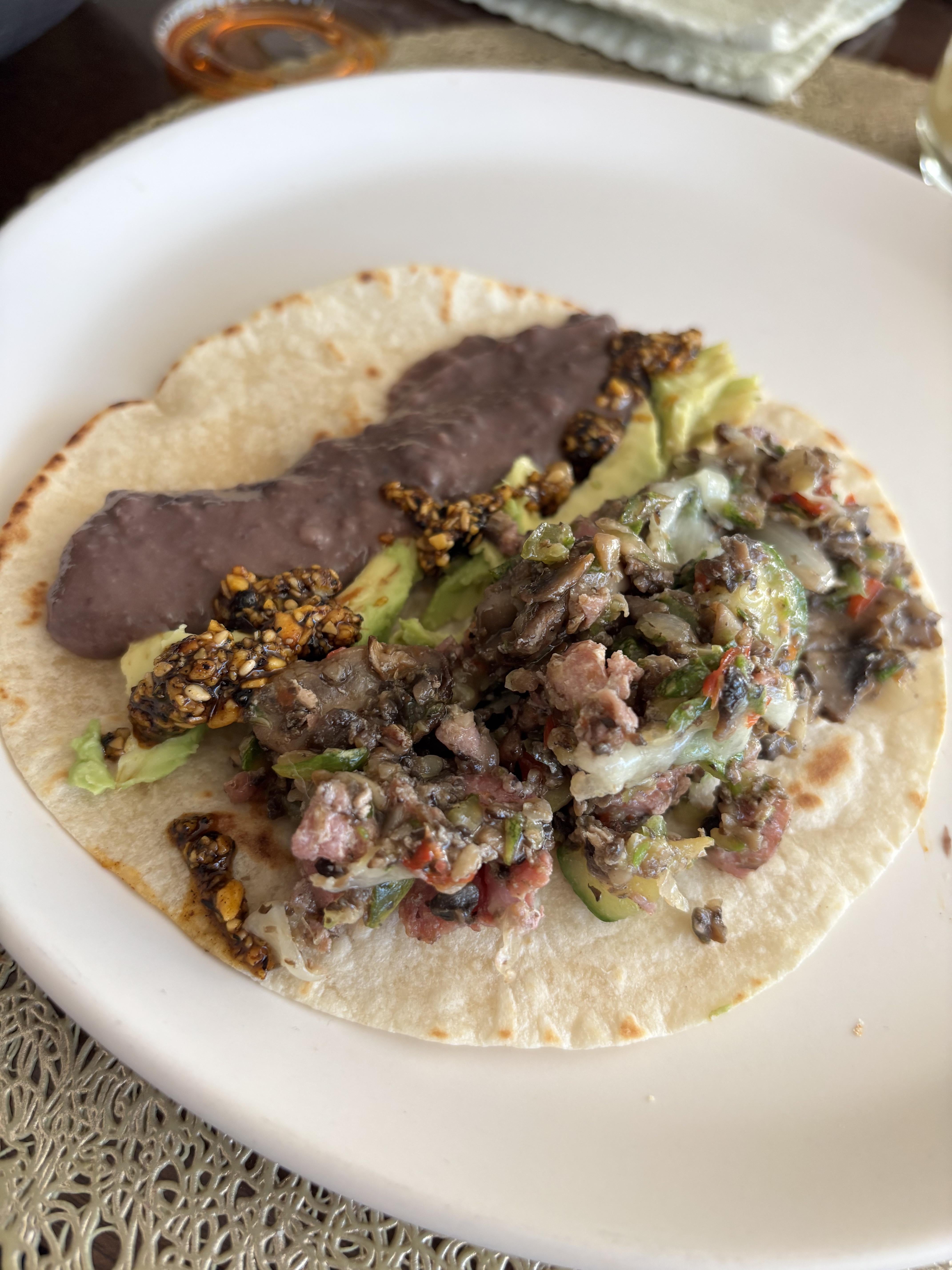 Tenía esto en el refri: Frijoles negros refritos, aguacate, salsa macha, alambre de atún con queso (con champiñones, calabacita y cebolla), tortillas de harina. Tal vez no se verá tan rico…pero quedó delicioso, jaja. by gabrielbabb Write A CommentYou must be logged in to post a comment.