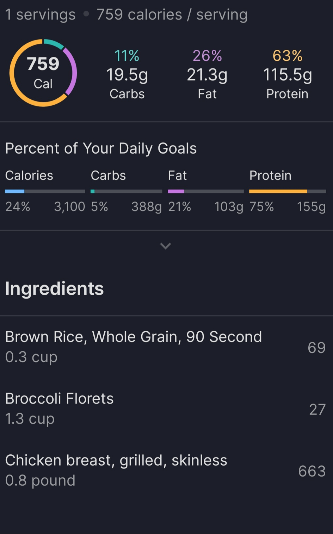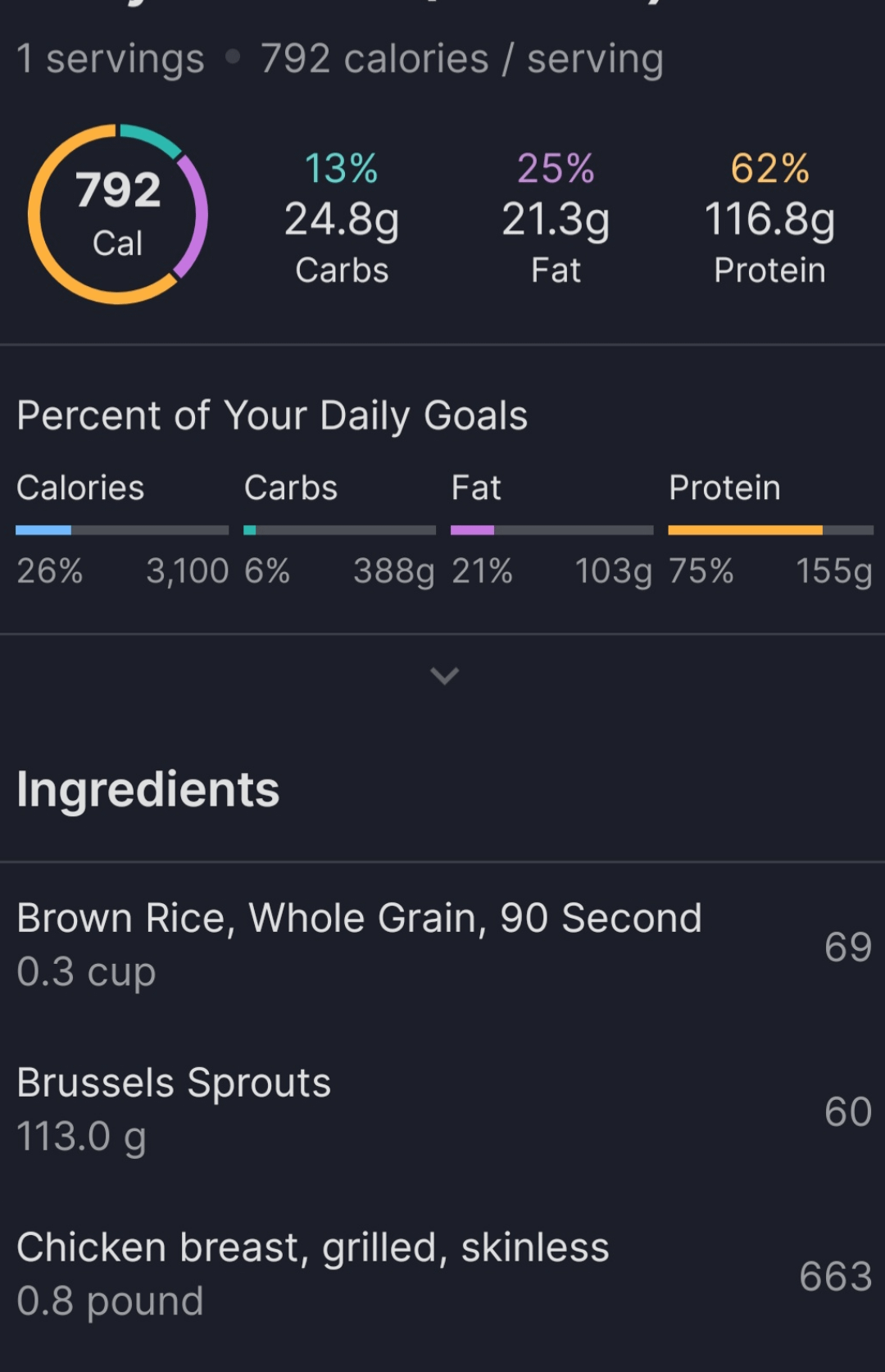 Ingredients: 4 bags of 90 second rice, brown. 10 pounds chicken breast. 2 bags frozen broccoli, 2 bags frozen brussels sprouts. Makes 12 servings. Macros in post.