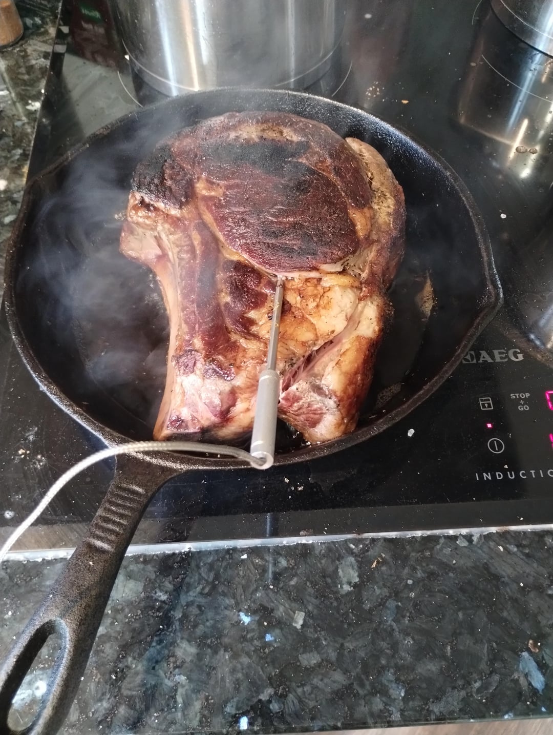 I did one of these recently, albeit at 137 for the sous vide– my only real complaint was that I wish I hadn’t actually put oil in the pan when I was searing it. Should have just cut off the fat cap and tossed that in first to give the pan a nice coating; it would have been plenty.