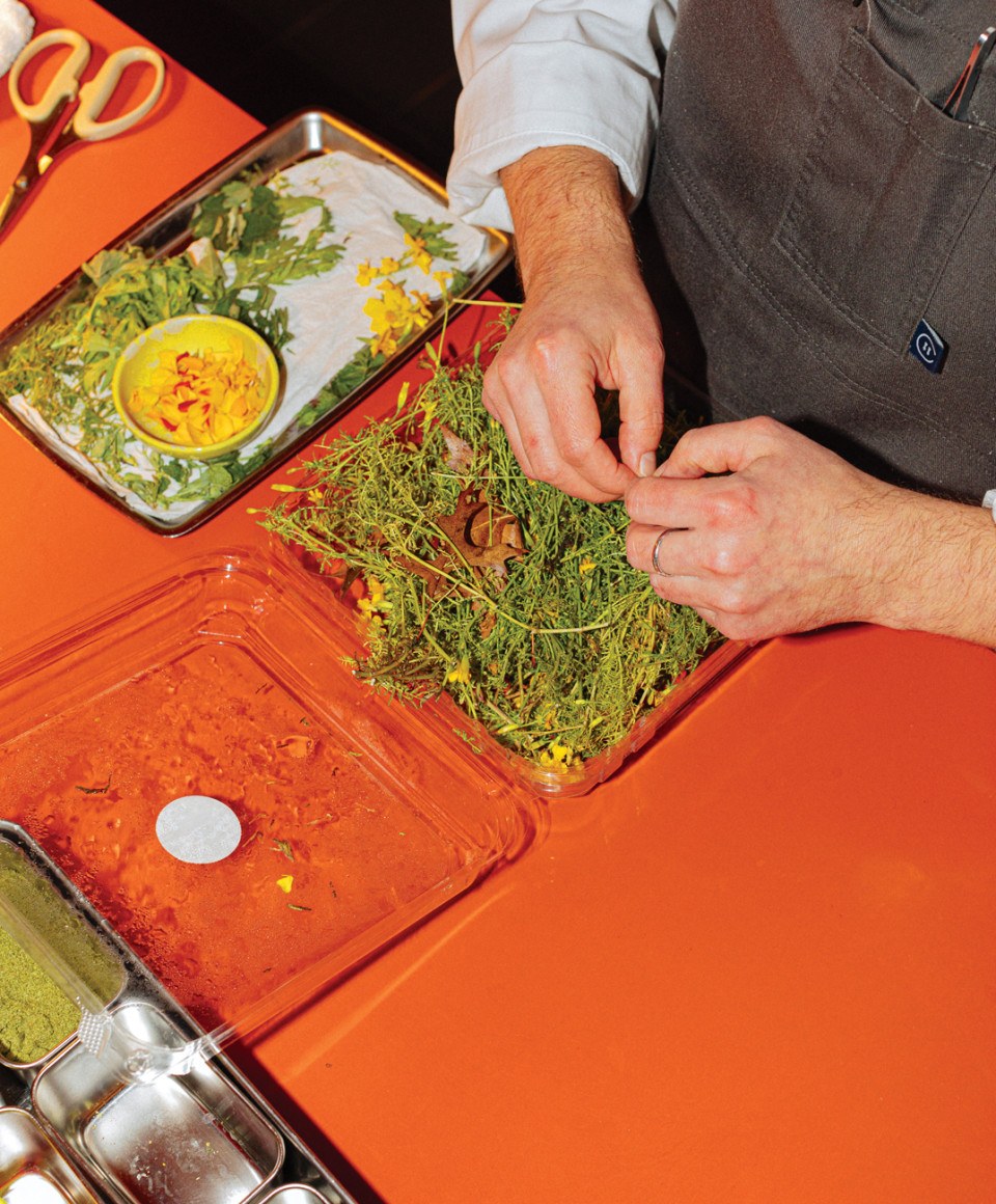 Hours later, the absinthe marigold will end up on a plate of marinated vegetables, bulking up some quick-pickled fennel that “wasn’t fennel-y enough.” The kimchi will bleed into a beurre fondue with sea bass and pork belly. They’re working on a new dish of chicken mousseline with snails folded in, stuffed into scratch-made, shell-shaped pasta, but it isn’t ready yet. Not for tonight.