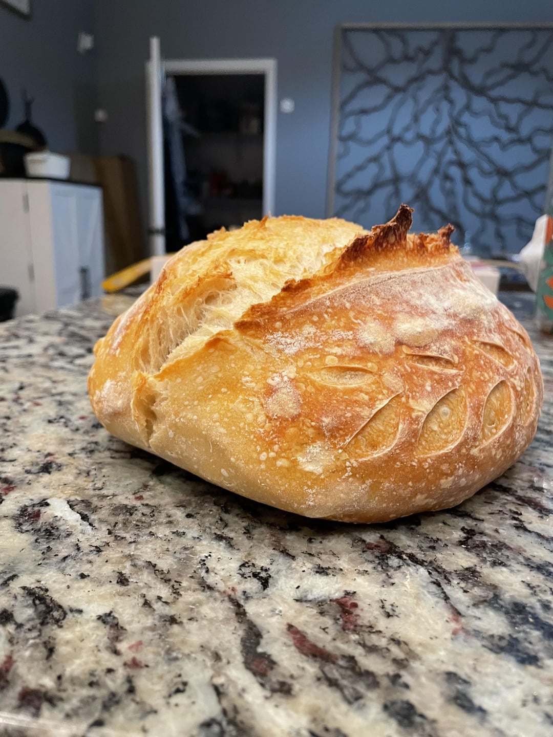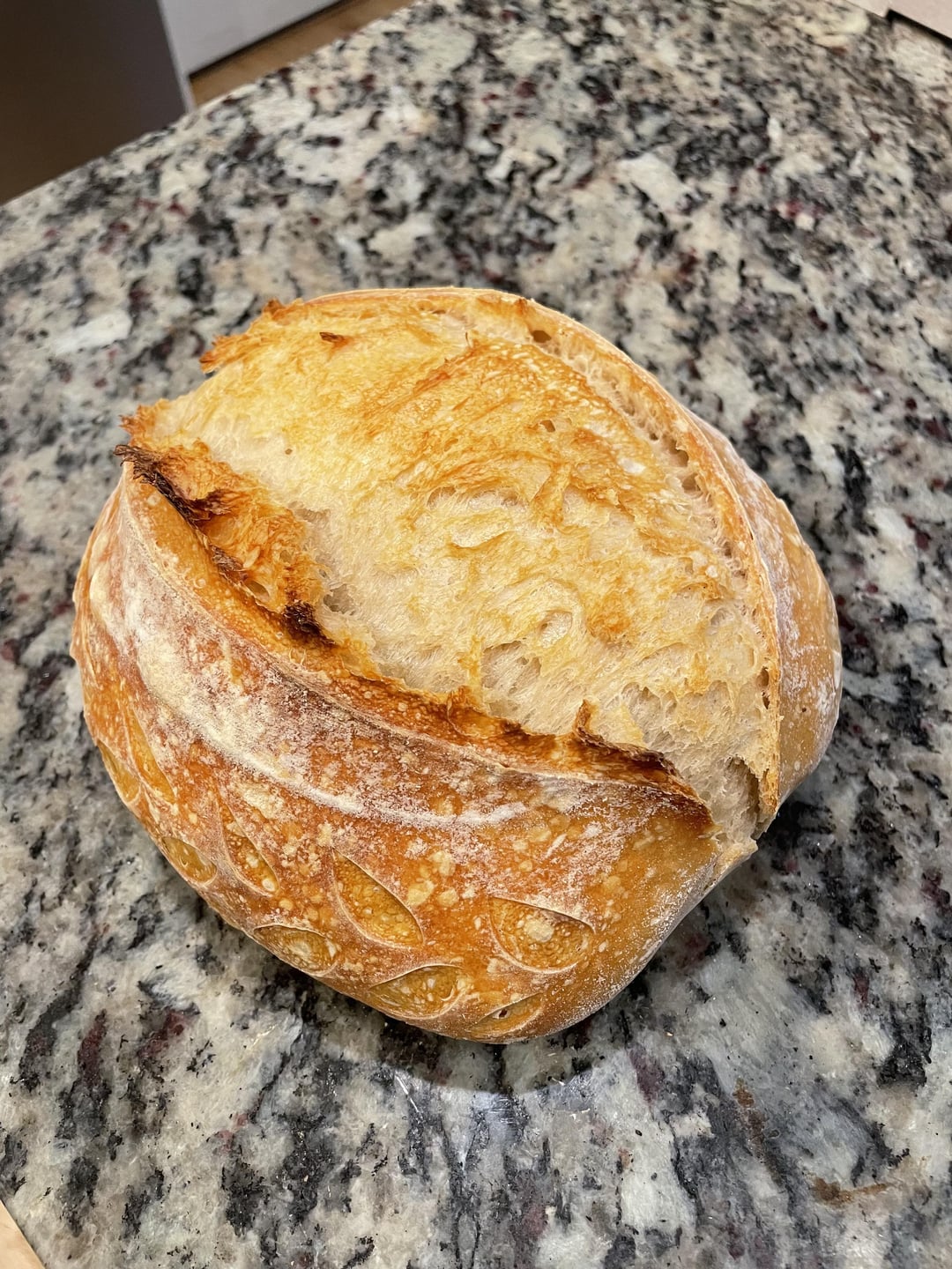 Baked at 450 in dutch oven for 30 min and then 400 with lid off for about 20min. Let cool over night on counter before cutting.
