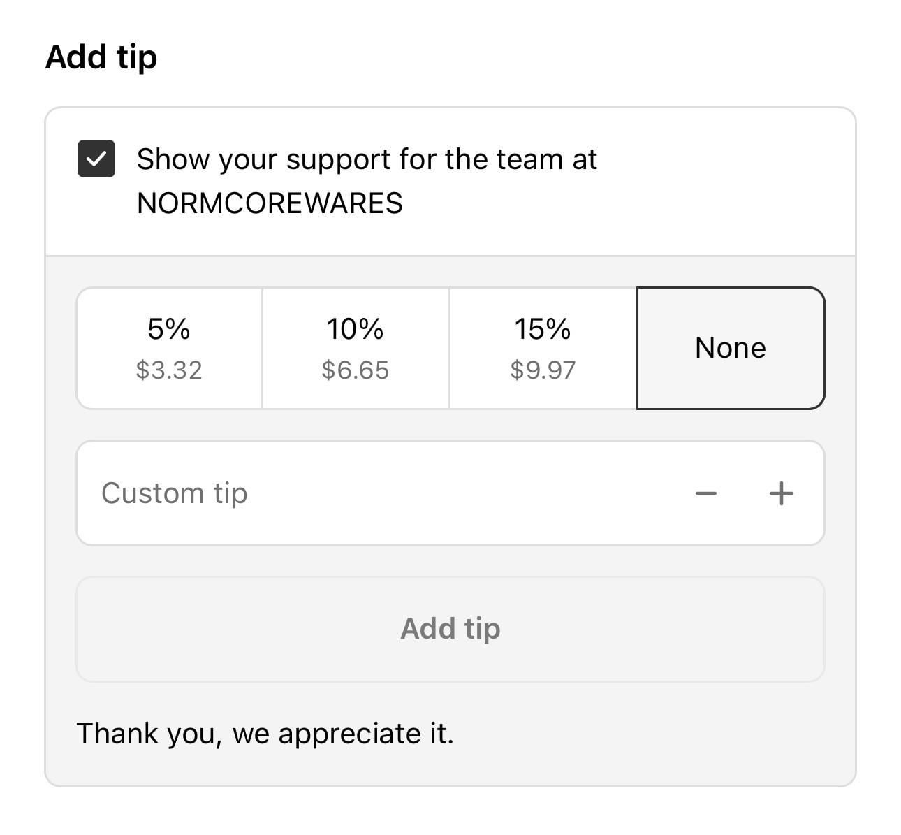 It looks like they’re using Shopify or a similar platform for their site. I really hate modern tipping culture, it feels like a push driven by payment processors, since their fees also apply to tips. They’ve all redesigned their systems to aggressively promote tipping.