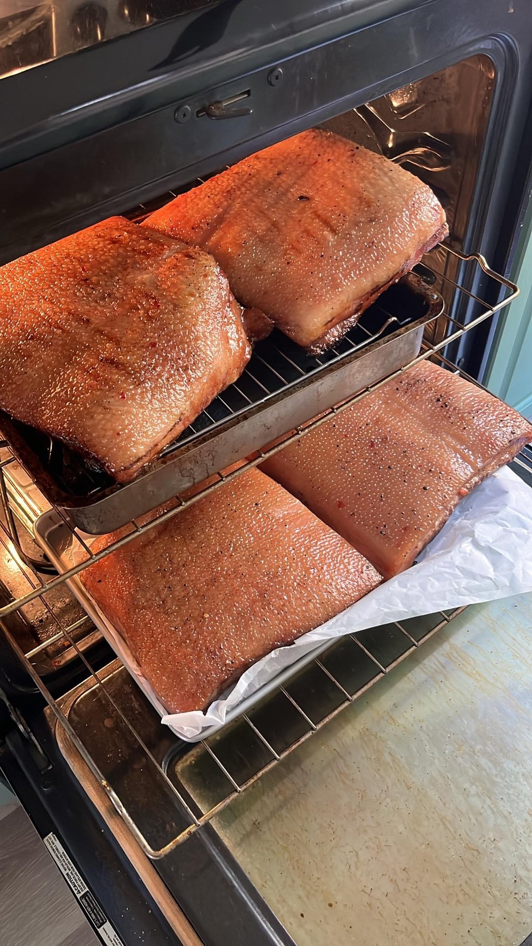 This has to be the best bacon I’ve made yet. 2 full pork belly’s from Costco, cut into 4 pieces and cured.