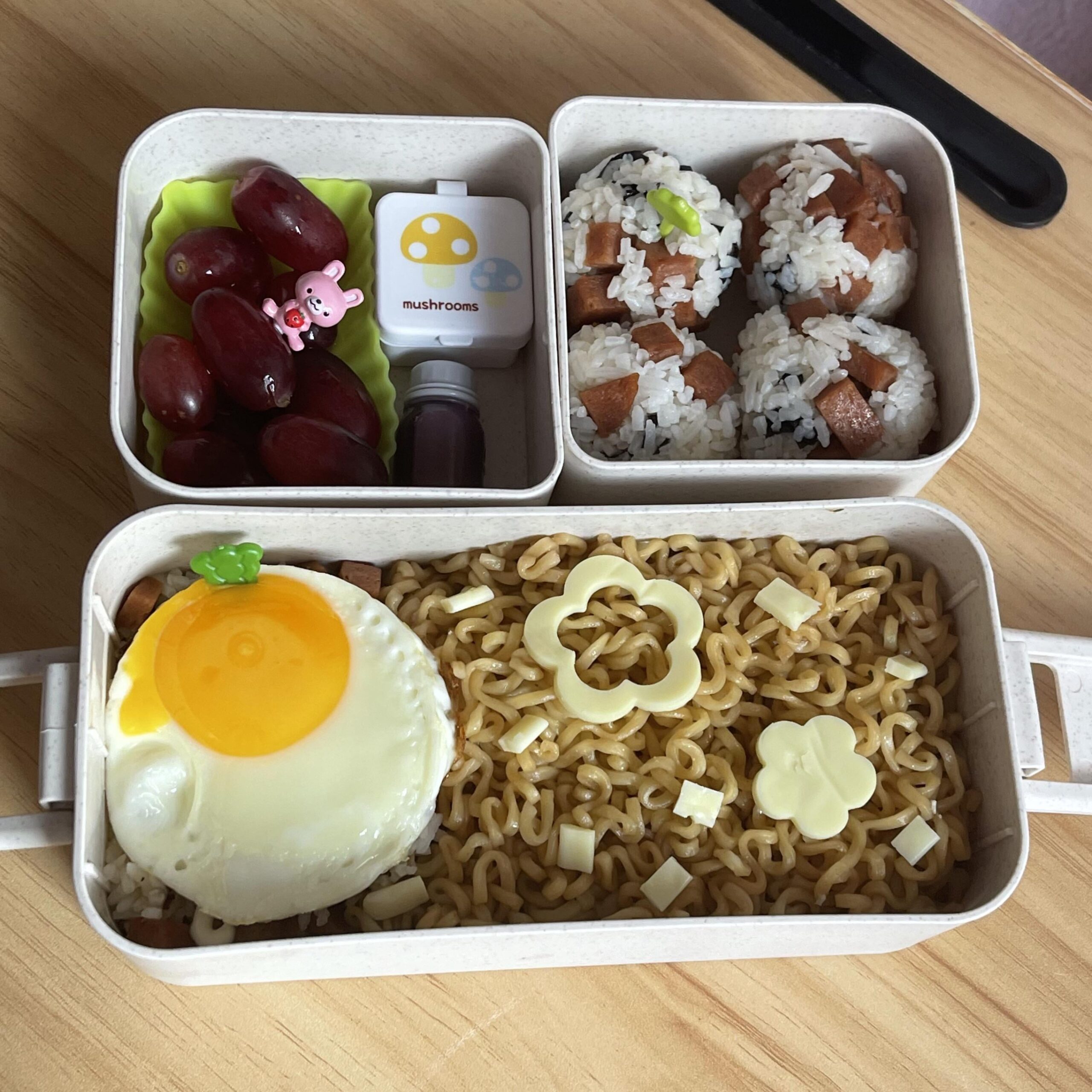 I used the leftover spam from my first bento! I wanted to try adding corn in the mini rice balls mixture but decided against it. Idk, i wasn’t so sure if my sister would like it 😅. I also got to sure a round mold for the egg when i was frying it! :3