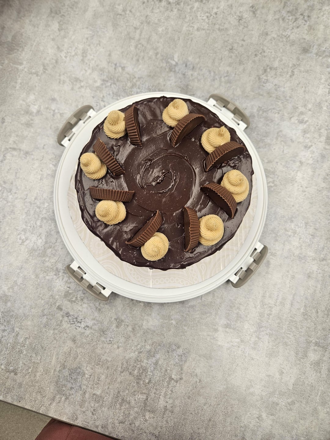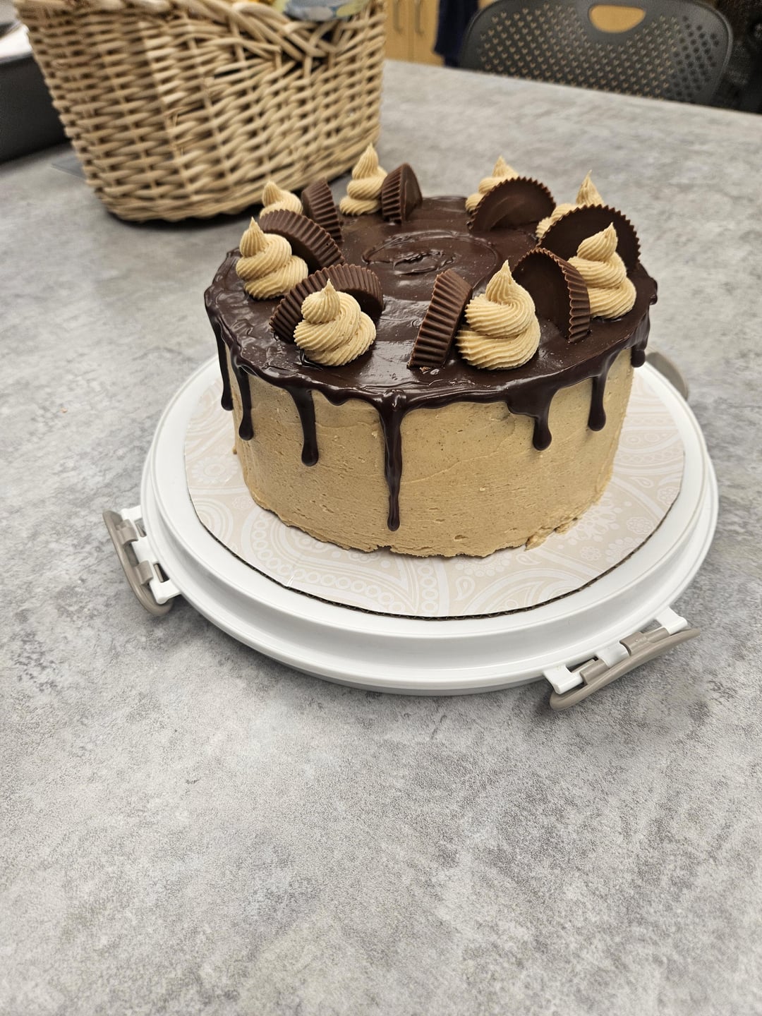 I had a month to plan the last one and only 5 days to plan this one so I kept it pretty simple. It's a chocolate vanilla marble cake with peanut butter cream cheese frosting, topped with chocolate ganache and Reese's cups.