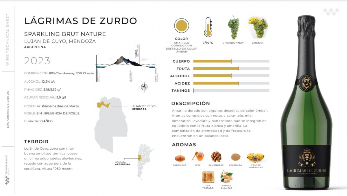 It is “watered with mountain spring water at an altitude of 1,050 meters,” and according to its manufacturer, it has a “complex and balanced aroma, with fine and lasting bubbles.” It is made with 80% Chardonnay grapes and 20% Chenin, has an alcohol content of 12.5%, and the manufacturer adds on the label that it also received 56% of the votes, referring to the election results won by Milei.