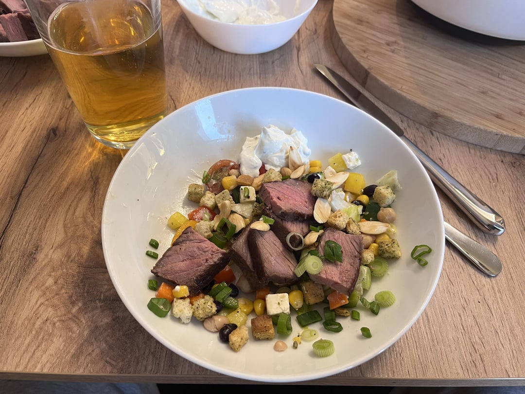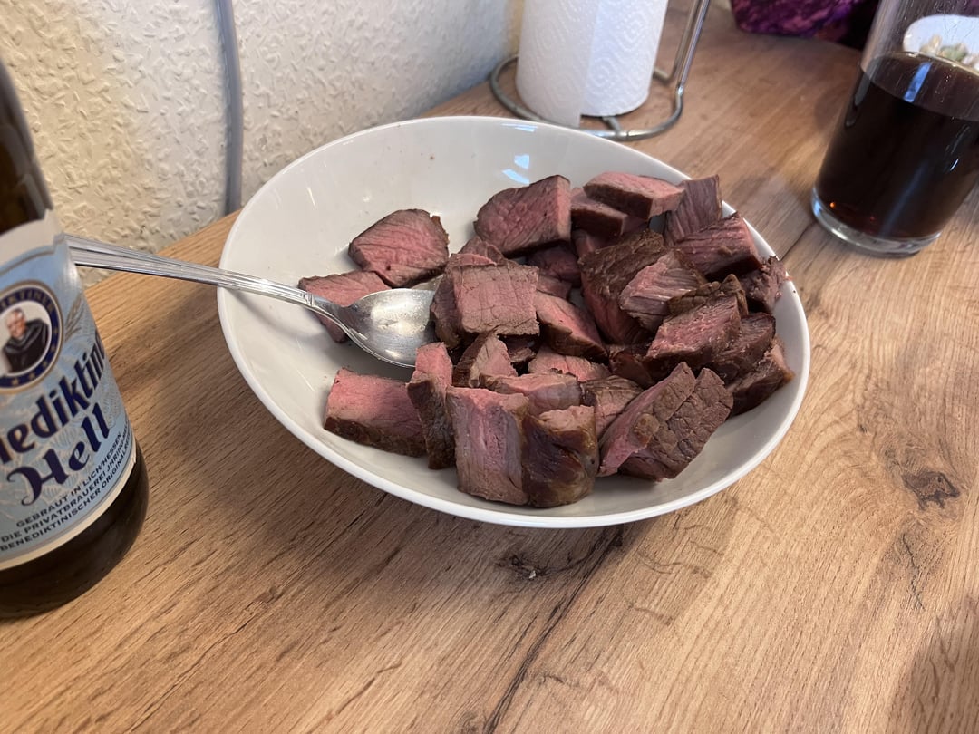 Needed some beef for salat and took ny strip for 2h at 137°F, just salt, quick‘n‘dirty.