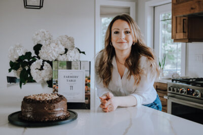 Christina Knaus poses with her book, Farmers Table Cookbook.