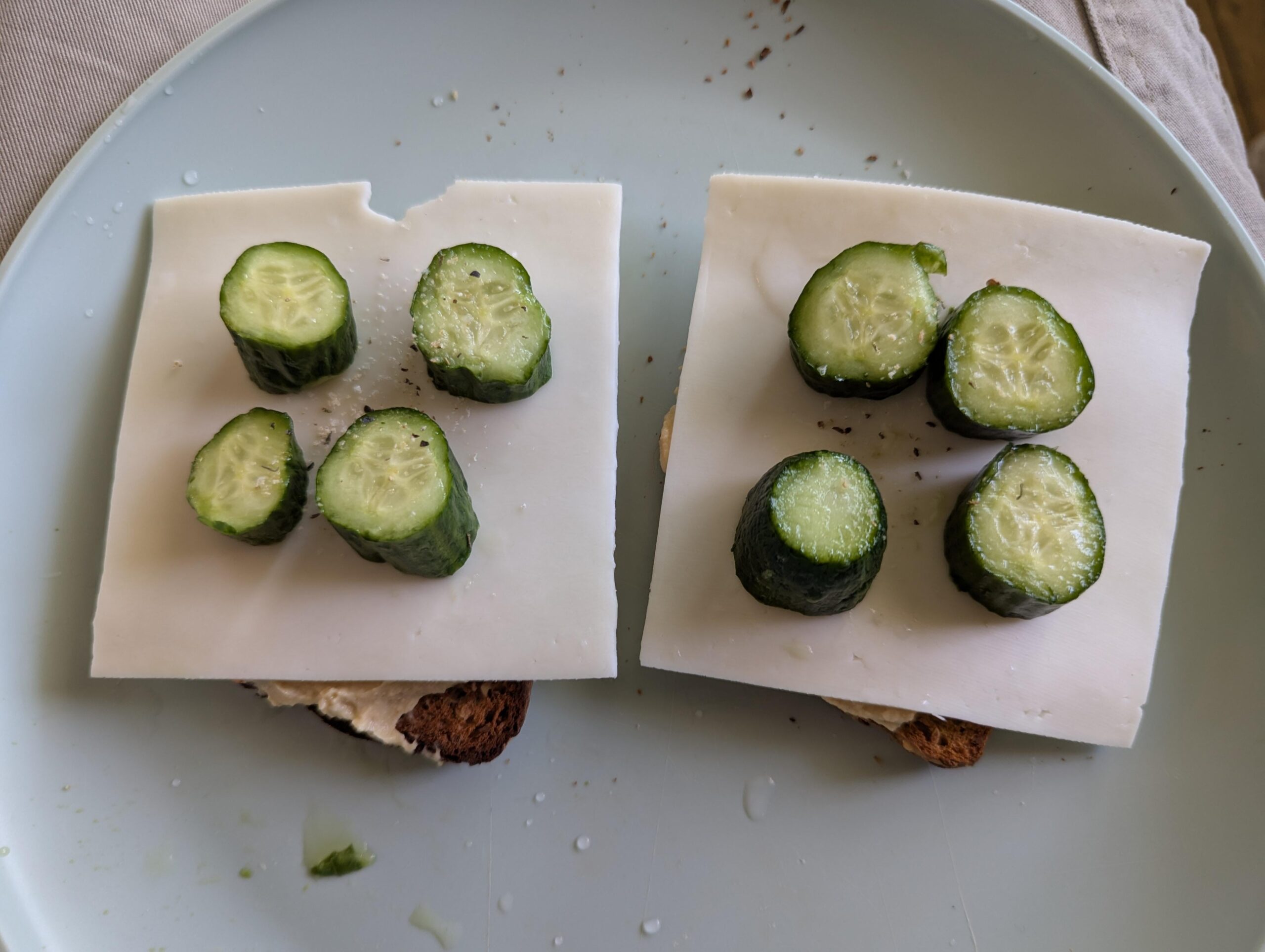 Sprouted Grain bread, toasted Hummus, spread on toast Goat Milk's cheese, sliced, on top of hummus One mini cucumber, sliced, on top of cheese Salt to taste by LuciusUrsus Write A CommentYou must be logged in to post a comment.