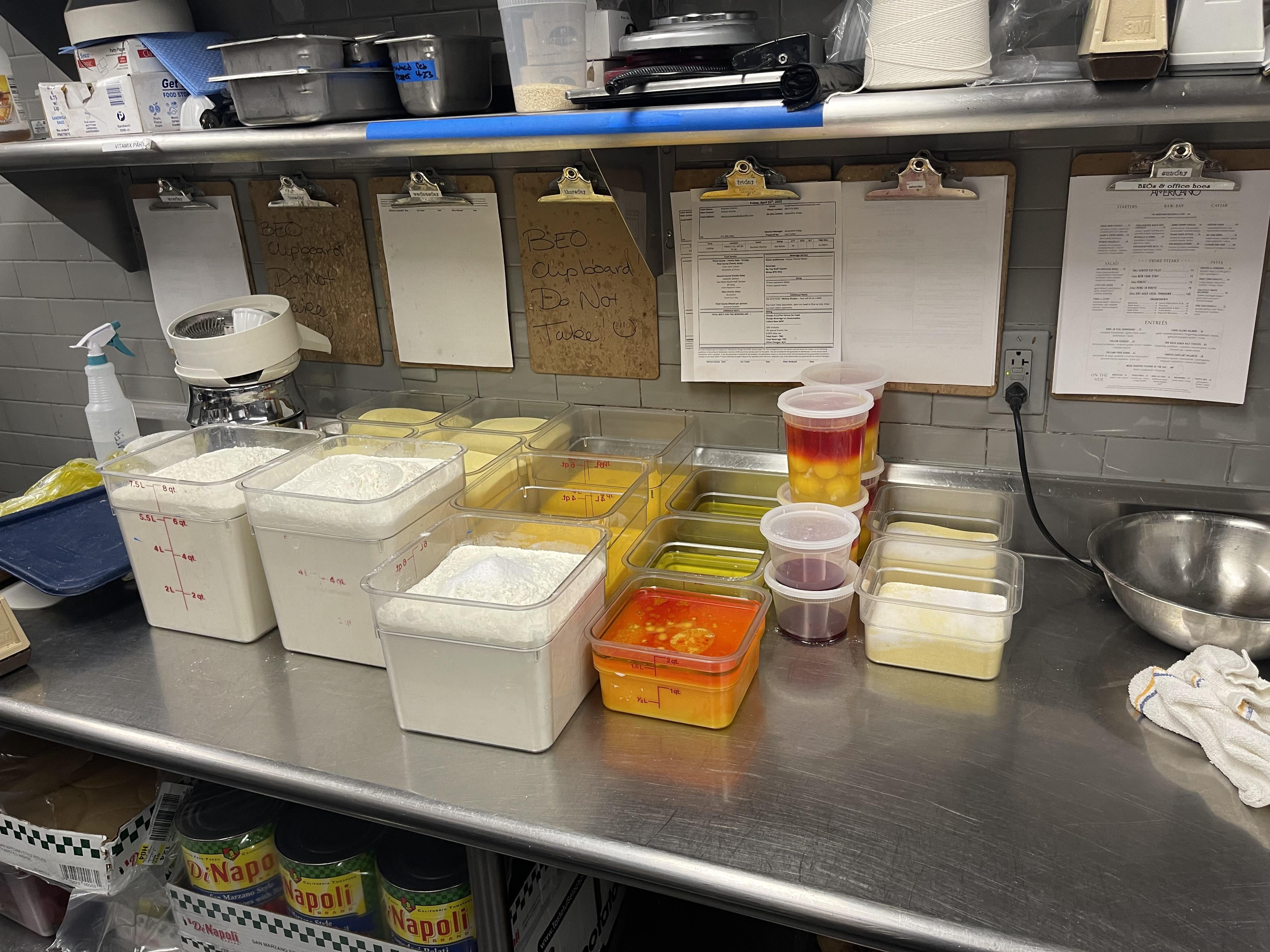 My Mise en Place for my shift this morning. This will make a lot of Cavatelli, Sheeted dough, and out agnolotti dough.