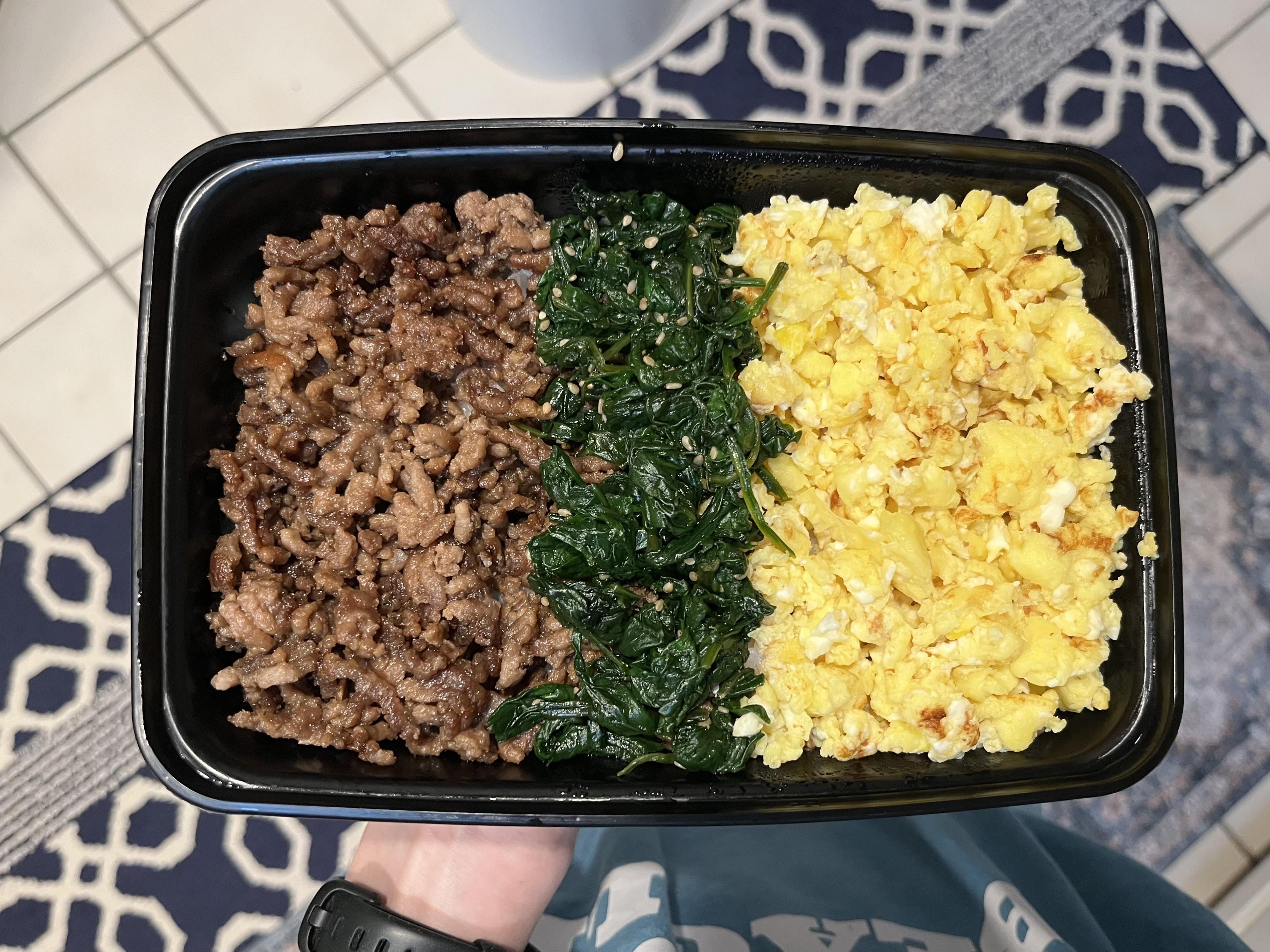 – soboro-don (japanese rice bowl with seasoned minced meat with scrambled eggs! i added spinach i seasoned with soy sauce, sesame seeds, sesame oil, and sugar for color)