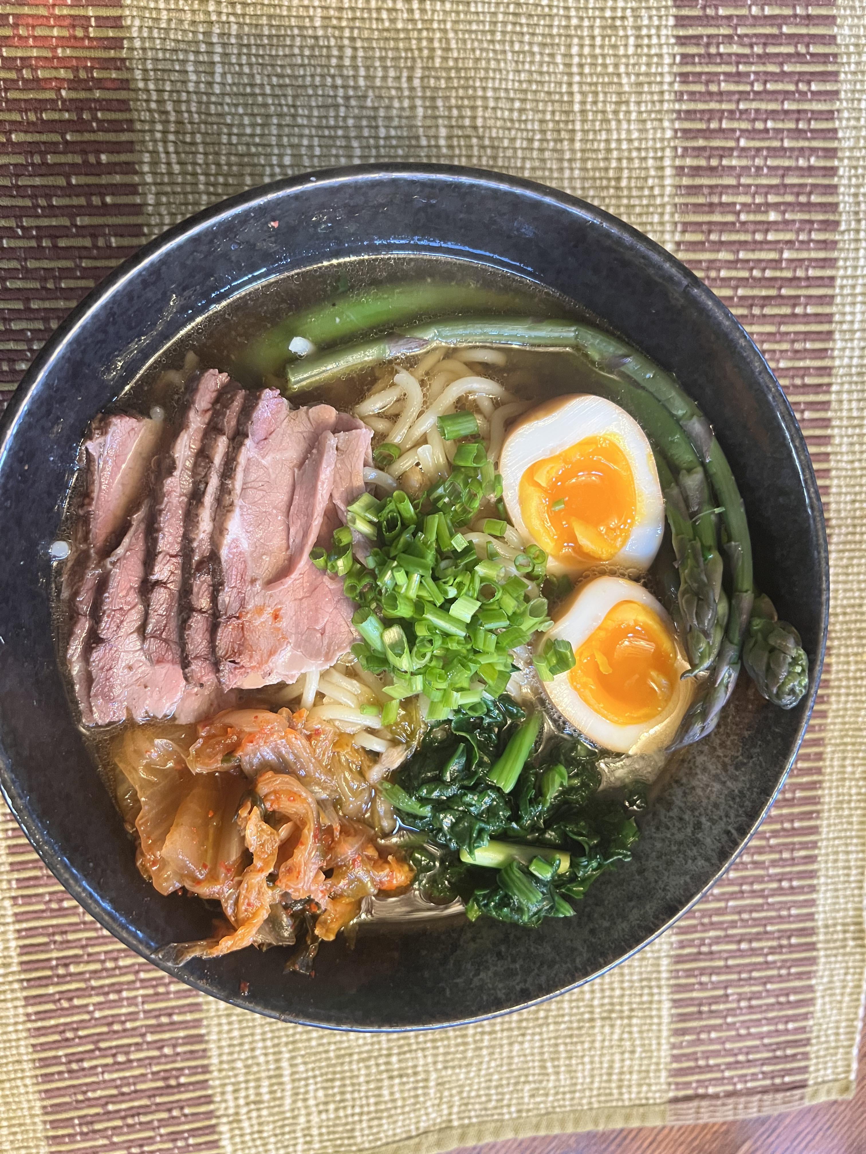 Smoked tri-tip (end of my freezer stash from the last catering job); ajitama eggs from the yardbirds; asparagus, spinach, and chives from the garden; with kimchi. Pork broth & shoyu tare. by InsertRadnamehere Write A CommentYou must be logged in to post a comment.