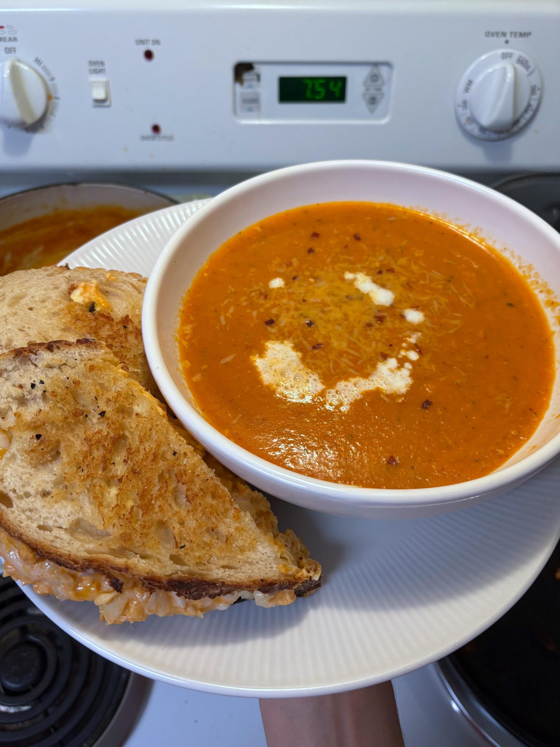 Had some luck with the recipe I’ve been using and my loaf came out quite fluffy! Thought it’d do well as a buffalo chicken grilled cheese sandwich🤗 and tomato soup of course!!😁