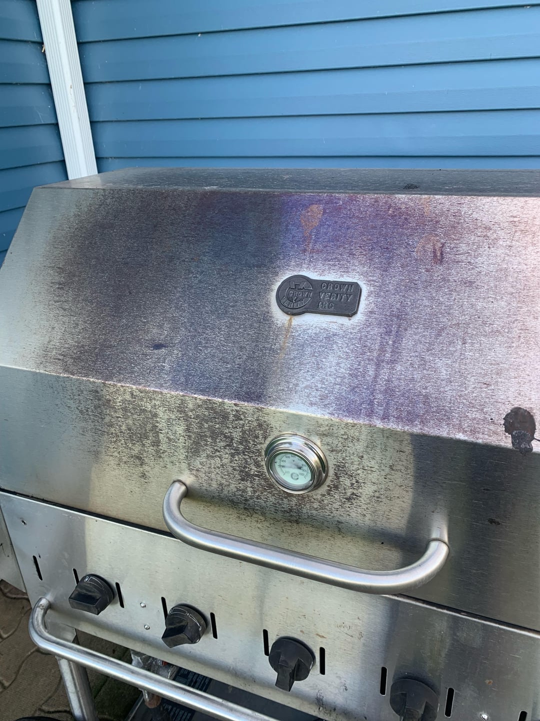 That’s a Crown Verity grill. Yes you can pretty it up. It’s the only grill that I know of that can be power washed. Open the lid and spray a whole can of Easy Off. It won’t hurt it as there are no delicate parts. Let it sit and power wash. Once the inside is clean, inspect to see if you need obvious part replacements. Hook the regulator up to a fresh full tank. Open the roll top. Turn on the gas. Stick a lighter or torch into the pilot hole and turn on the pilot knob. If that fires up, try turning on the burners one at a time. It should get up over 500 degrees within a minute or so with the lid closed. You might need to change a deflector plate or burner if it has been abused. Crown Verity is an easy call or visit for replacement parts and they will be very helpful to get up and running. Now for the ascetics of the outside. Who ever used this grill got it way too hot and scorched the lid which is easy to do on a commercial grill. Sometimes the gold burnt discolouring comes out sometimes not. I would start with Bar Keepers Friend soft cream (Lowes). Wipe with the grain which is sideways on that roll top. Follow up with a fresh micro fibre cloth and windex. This method will really clean up the grill sides, legs and base but maybe not so much on the dome. You can step up the cleaning with Bar Keepers powder but be careful as it can etch if you wipe in the wrong direction. From your picture it looks like you have a 36” or 48” mobile Crown Verity. Cost about $4500 to $6000 but I haven’t bought one in a very long time. I personally have a variety of three at the moment that are over 20 years old. This grill is worth every bit of effort to restore. Too bad an inexperienced rookie had to scorch the roll top. Oh, for the grates, I spray with Easy Off and stick them in a big garbage bag overnight. Boom just like new. Hopefully your roll top cleans up. I think replacement is around $500-$1000 or it used to be.