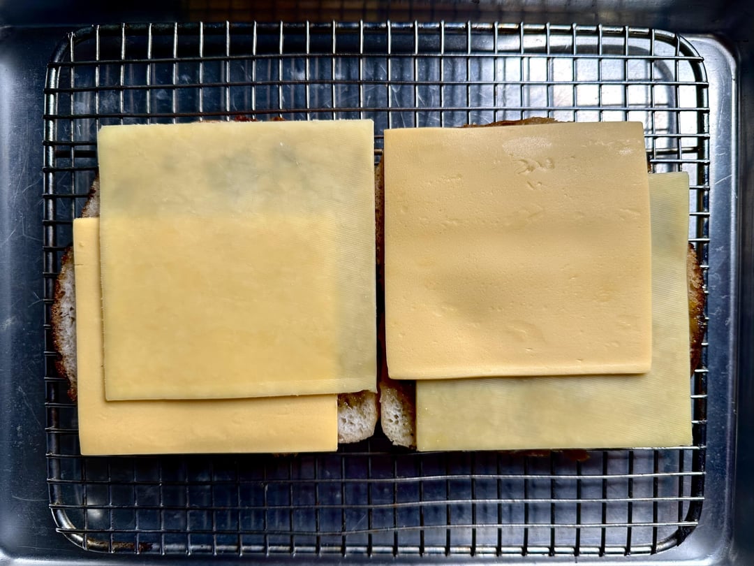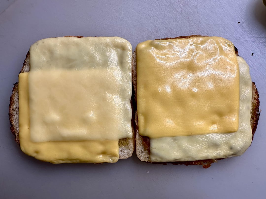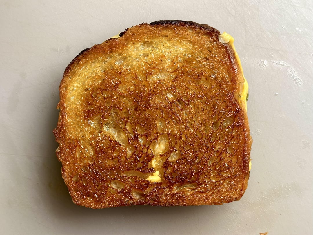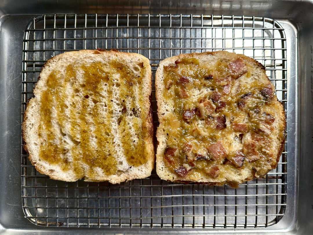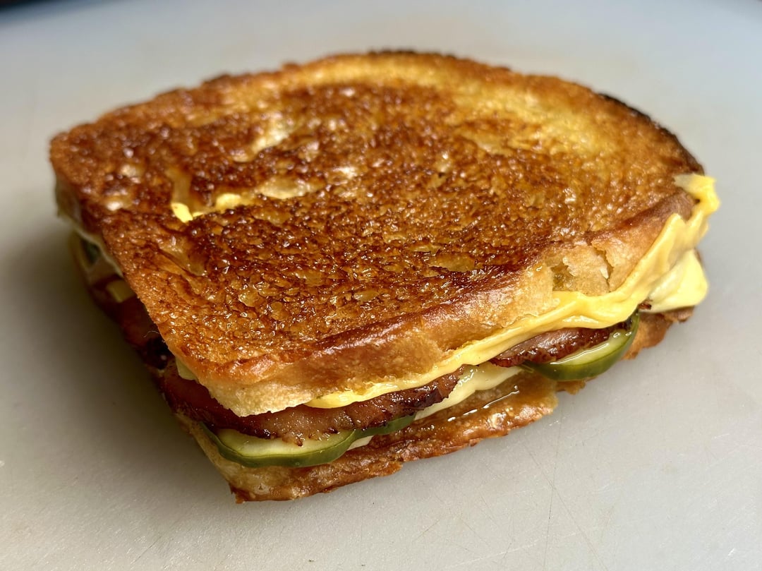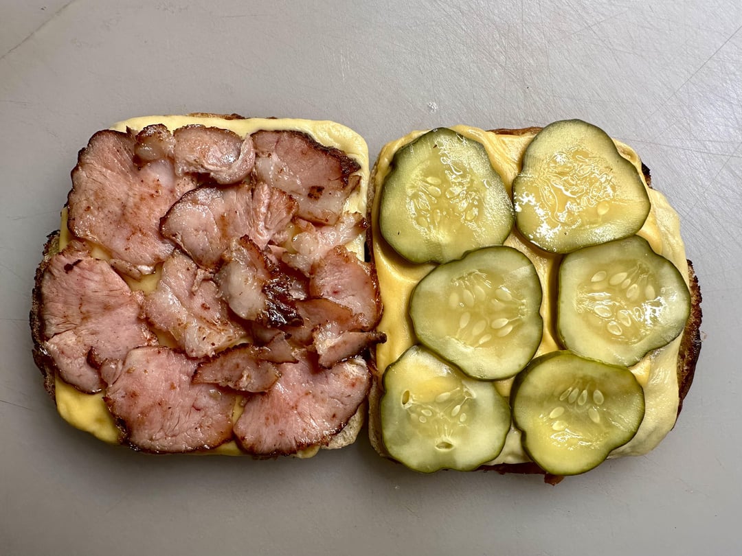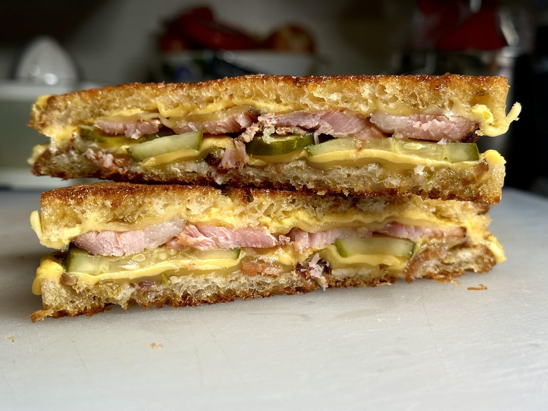 Homemade crusty white bread grilled with Kerrygold butter and a weighted press, American and Gouda cheese, my maple jalapeño lime sauce, homemade bacon jam, leftover smoked and glazed ham, and my mustard pickles.