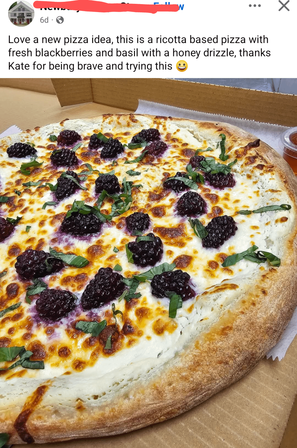 It’s not like they threw blackberries on pepperoni and marinara. Berries, ricotta, and honey is actually a great combo and this is just like serving it on crusty bread.
