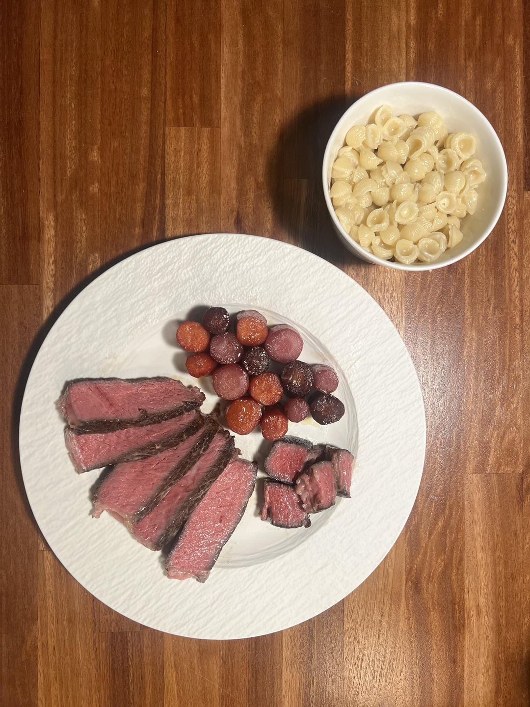 Prime rib eye from Costco at 137, 3 hours from the freezer, then back in the fridge uncovered to dry out.Kenji’s sous vide carrots + shells and a paper plane.by Couchlock123 1 Comment ApplicationRoyal865 9 months ago I did a double take because I thought you put a bunch of hotdogs with a ribeyeWrite A CommentYou must be logged in to post a comment.