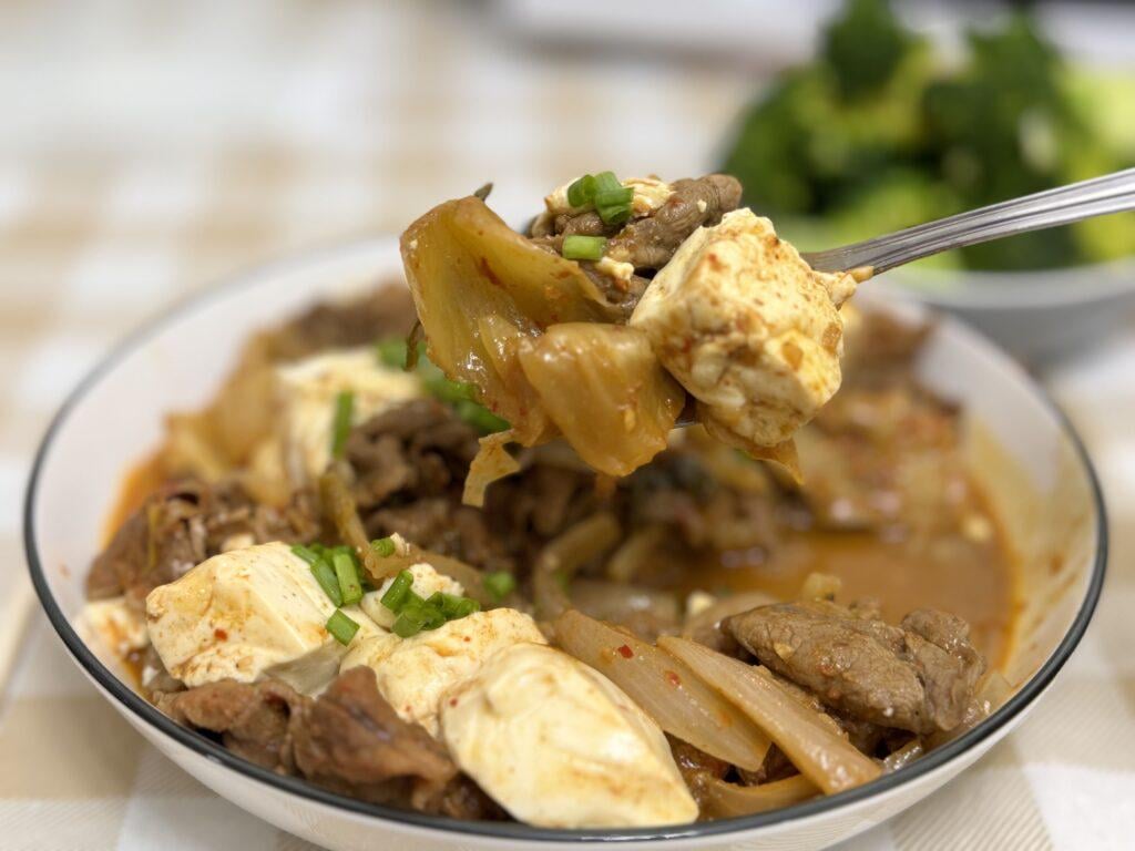 * 300g Shabu Shabu Beef * 220g Tofu * 300g Kimchi * Half of a medium onion * 1 tbsp Gochujang * Sugar and sesame oil to taste * Spring onions for garnish