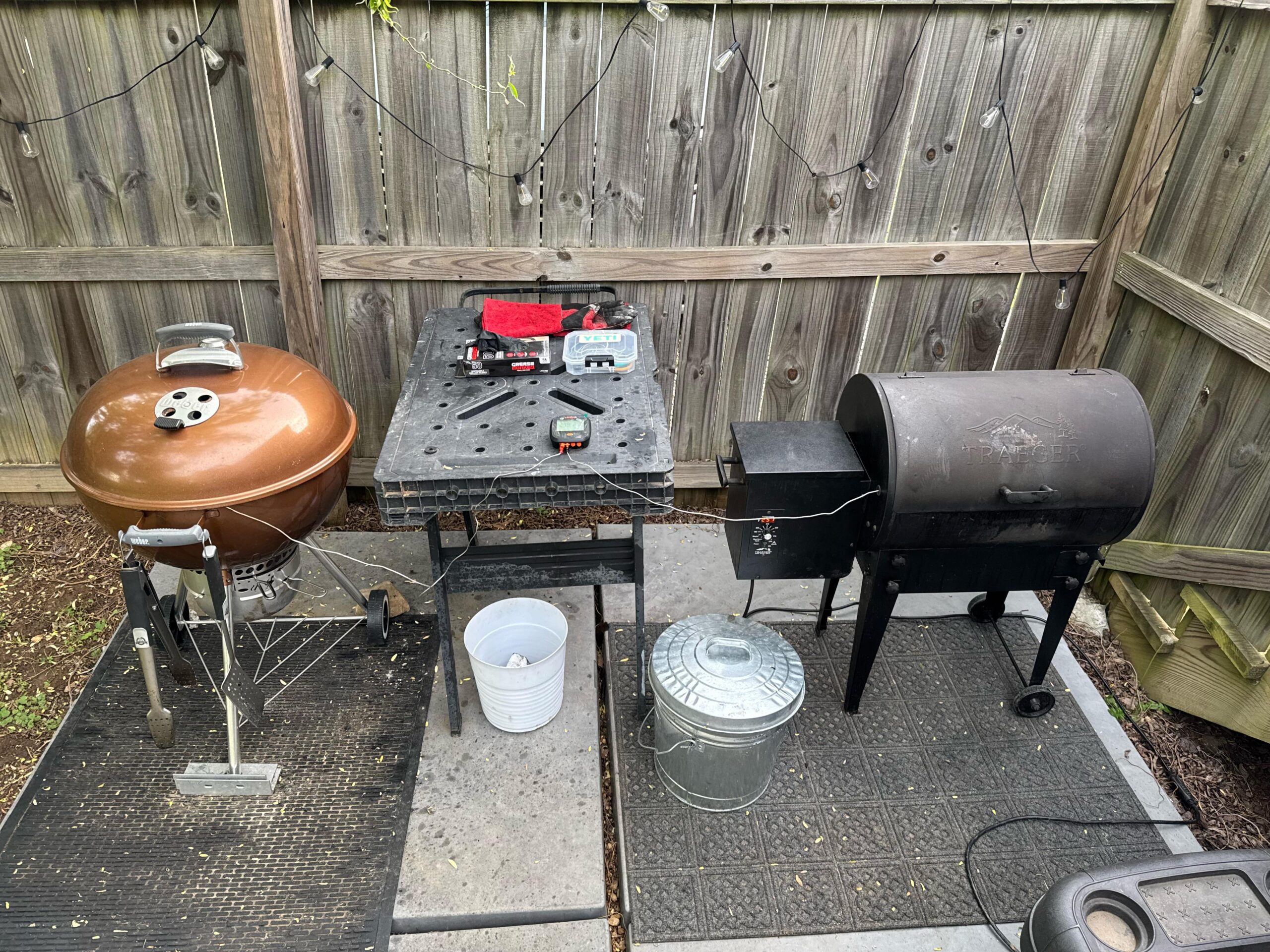 2 St Louis racks on the Weber. Snake method with some apple chucks along first 3rd running about 220 right now. Traeger has another rack and the trimmings. Hope to be enjoying these as I talk about Liverpool winning the prem! 👊🏽🔴