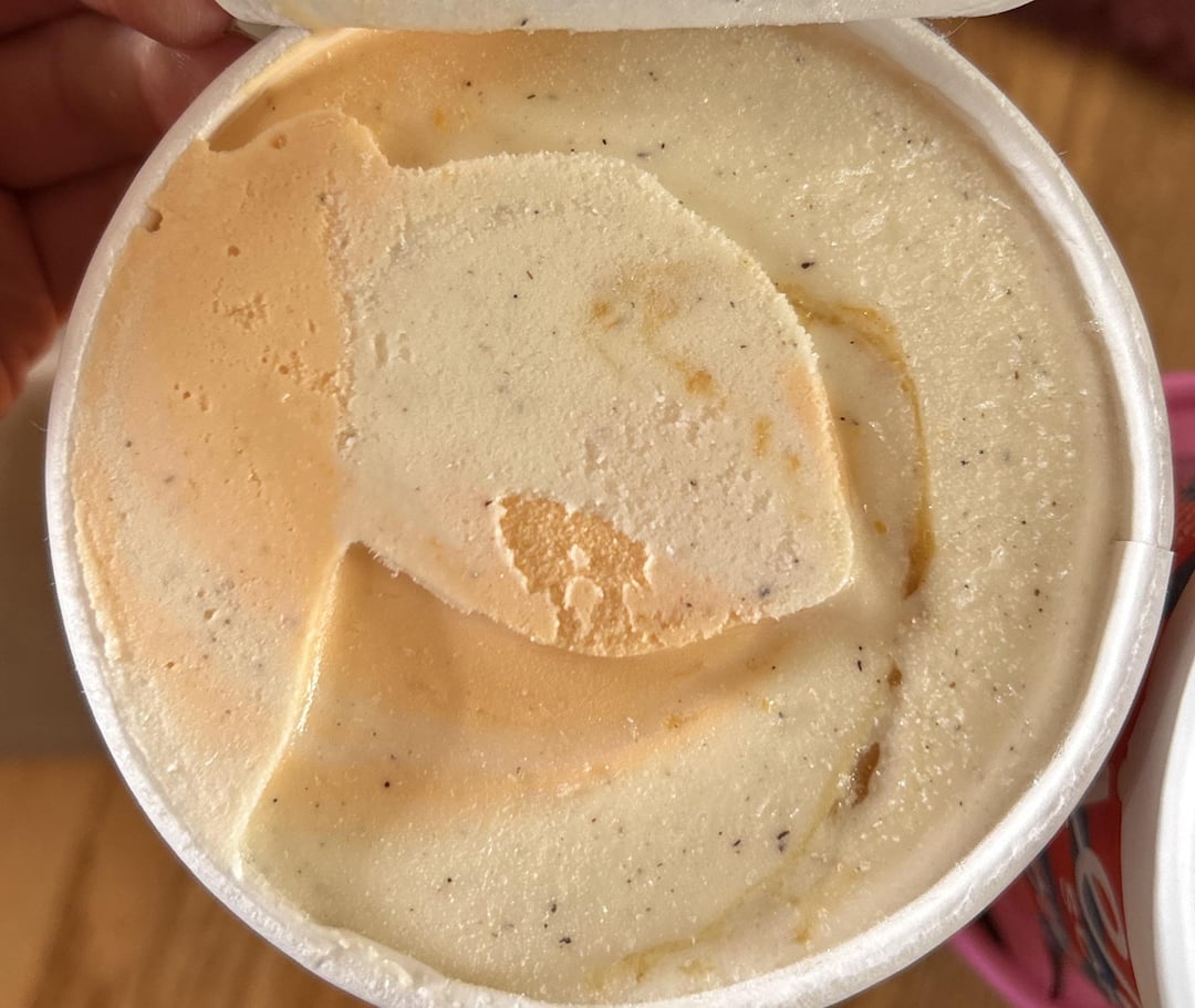 7.5/10 – I’m close to giving this an 8/10, but there’s something keeping me from it. I’m a huge fan of orange creamsicles, and this pint puts a fun twist on a classic flavor. The orange swirl is very refreshing and sweet like a fresh orange slice, the vanilla custard swirl is smooth and creamy but I don’t get the strongest vanilla bean flavor. The burnt orange swirl is a little hard to find and I had to dig through the top to get to it, but once you get a bite, you’re hit with a slightly salty, rich orange and caramel flavor. I actually think the caramel is what throws the flavors off for me. Usually, I’m a huge fan of caramel swirls, but this doesn’t seem to fit the flavor profiles. All together, there’s an off putting tang, like if an orange was placed in a hot skillet and someone spilled milk on top of it.